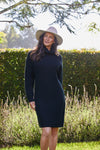If your dress features a crew or v-neckline, you can layer it over a button-up shirt and let the collar peek out the top. This can be a stylish way to incorporate a print into your outfit too. Just add a pair of riding boots and tights, if you’d like, to complete the outfit. The overall look is classic with just the right touch of preppiness.