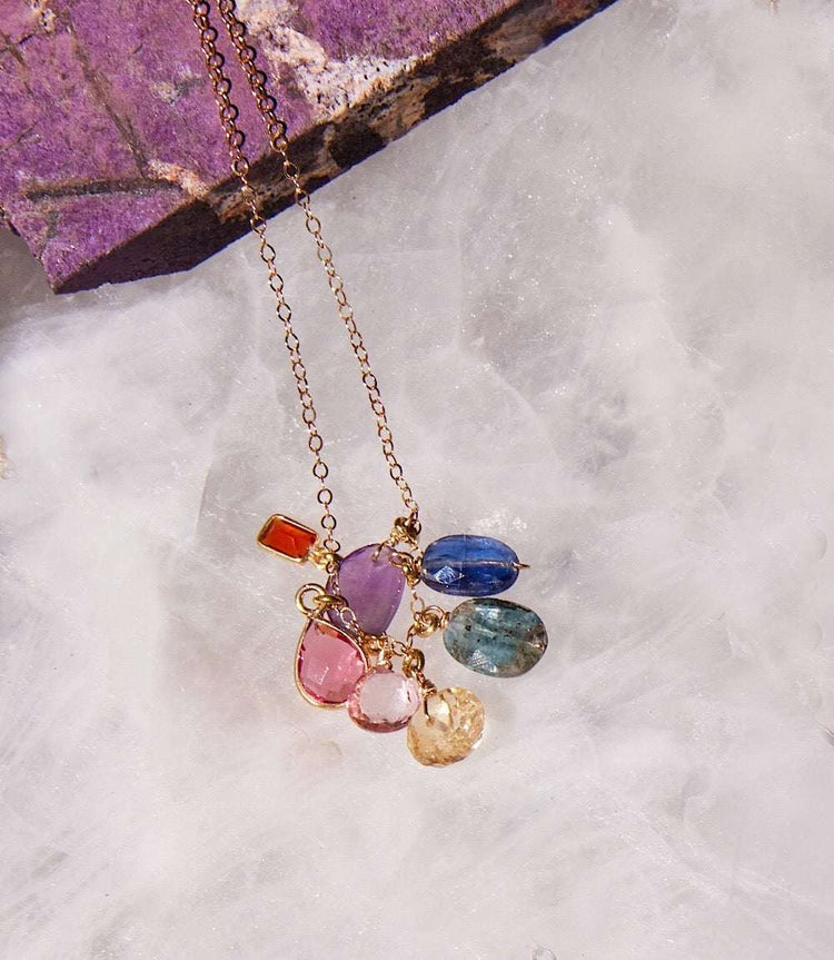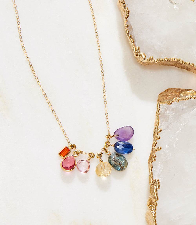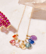 Colorful gemstone necklace with assorted charm stones on 14k gold vermeil chain