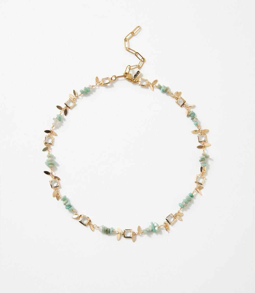 Add a touch of soft shimmer to your look. This necklace features aqua-toned gemstones paired with sparkling crystal accents and delicate gold details. The design includes a modern paperclip link chain and an adjustable extender for a perfect fit, finished with a secure lobster clasp for comfortable, everyday wear—perfect for layering or wearing on its own.