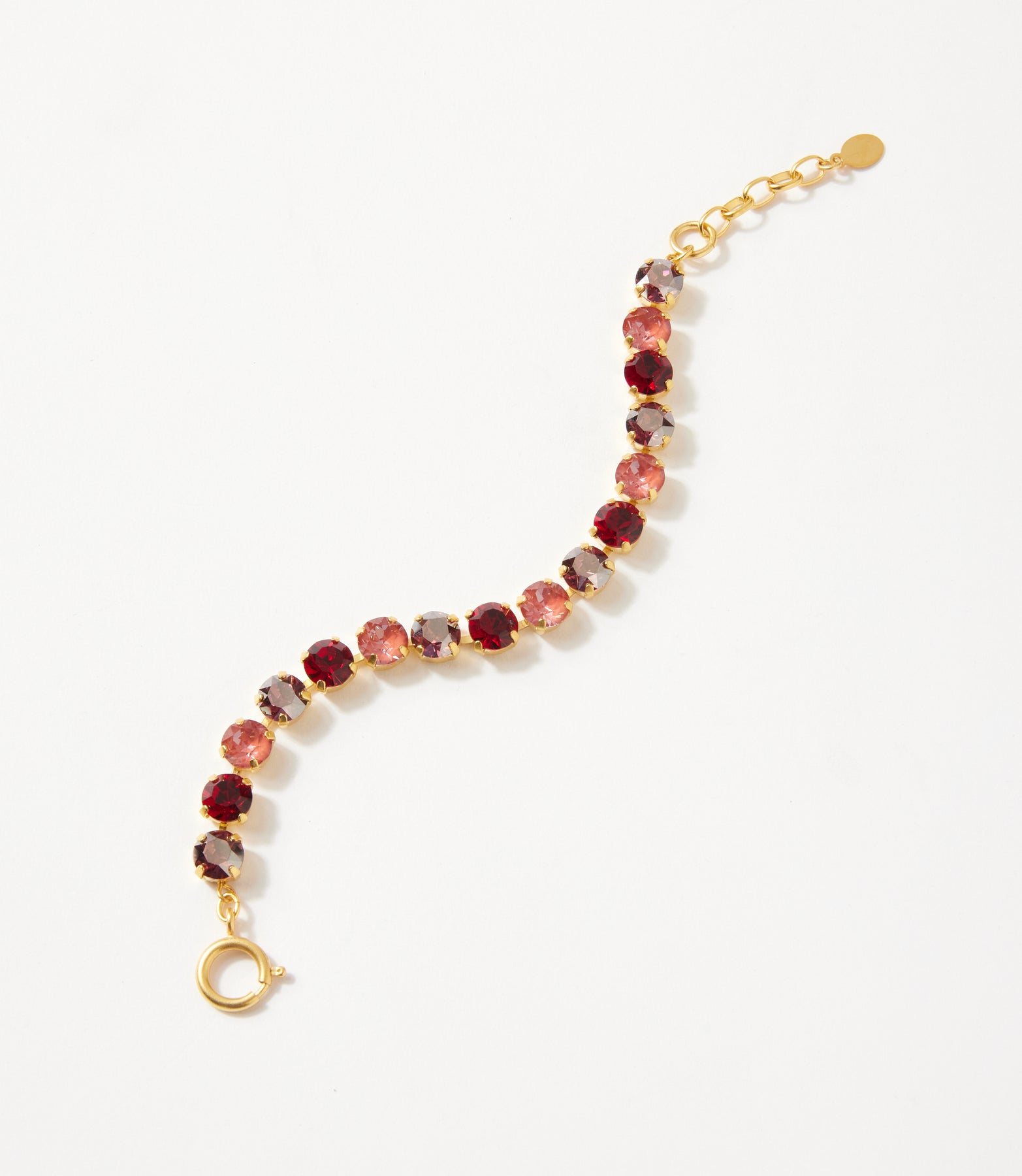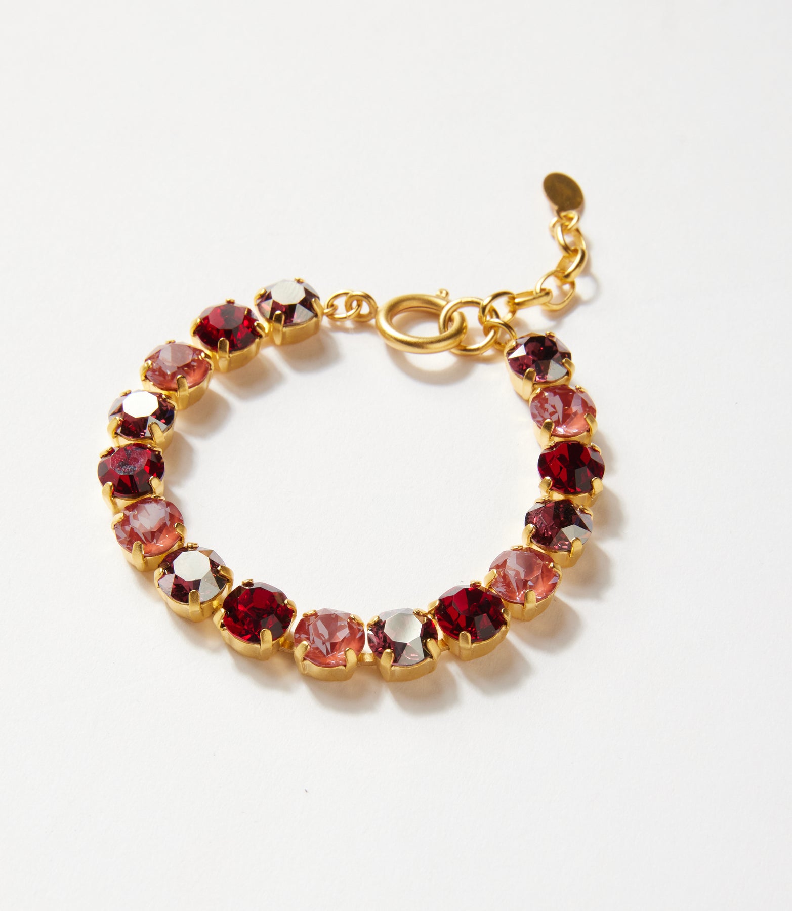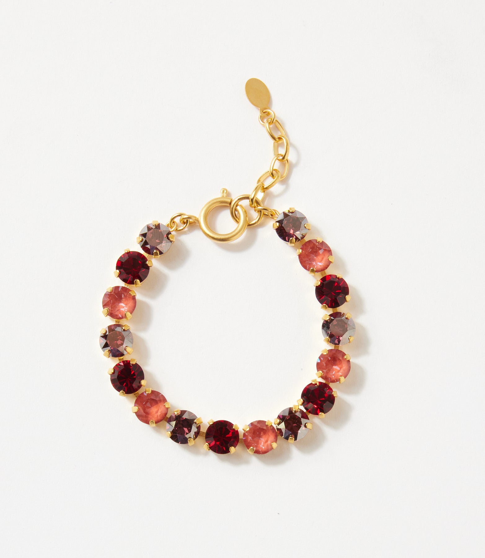 Elevate your look with the Crystal Chain Bracelet, featuring a row of deep red crystals that radiate warmth and elegance. Set in a refined gold-tone chain, this bracelet adds a sophisticated pop of color to any outfit. Designed for comfort and versatility, it is finished with a secure spring clasp and extender chain, allowing you to adjust for the perfect fit.