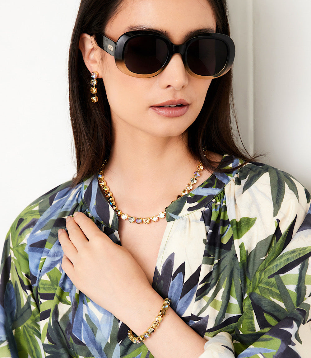 Shimmer with ease in this crystal stretch bracelet, designed in a warm honey hue that catches the light beautifully. Set in gold-tone detail, each faceted crystal adds radiant sparkle and elegance. With its stretch design, this bracelet slips on effortlessly—no clasp needed—making it a versatile and stylish choice for both everyday wear and special occasions.