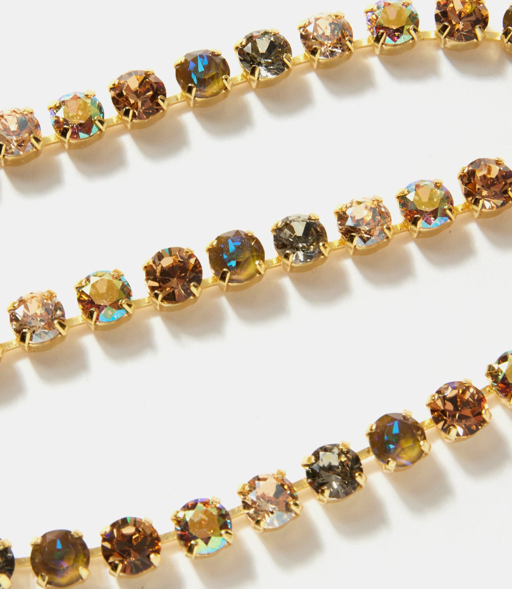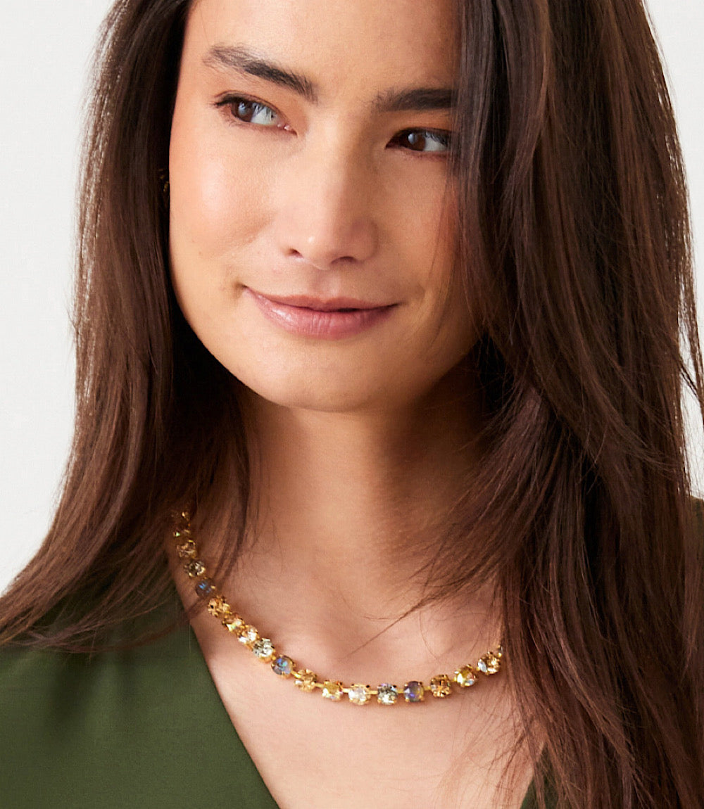 The Gemstone Tennis Necklace features a continuous row of sparkling honey-colored gemstones set in a gold-tone design for timeless elegance. Finished with a lobster clasp closure and extender for adjustable length, this necklace is perfect for adding refined shimmer to both everyday looks and special occasions.