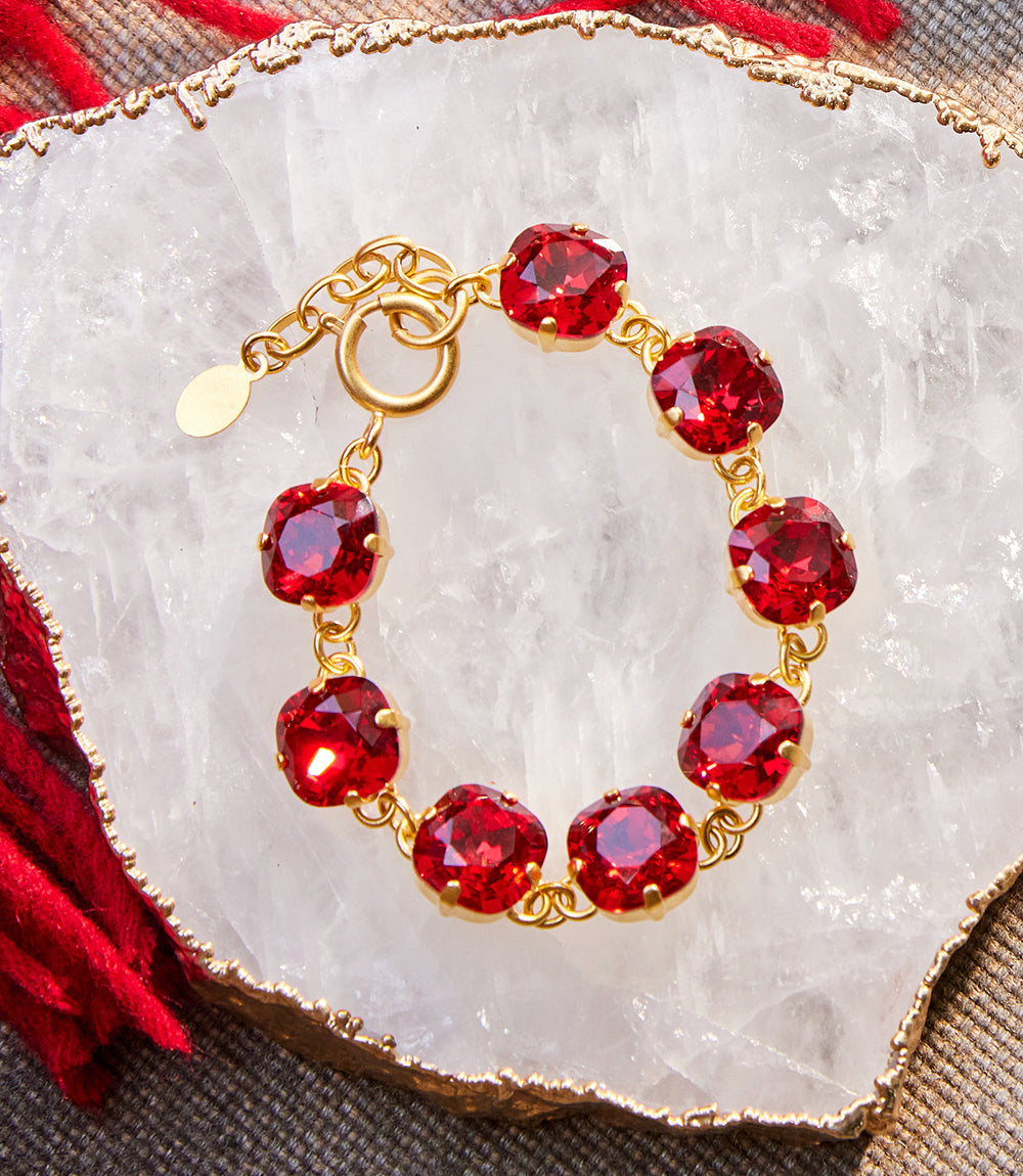 Make a bold statement with the Large Crystal Bracelet, designed with oversized, faceted red crystals that dazzle with every movement. Set in a polished gold-tone frame, this bracelet balances glamour and sophistication, making it perfect for both special occasions and elevating everyday style. It features a secure spring clasp and extender chain, allowing for an adjustable and comfortable fit.