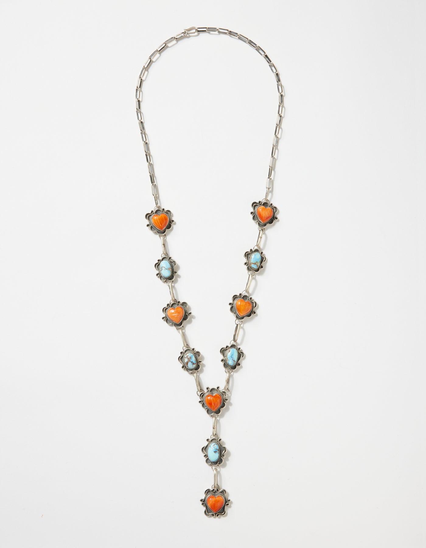 This Spiny Oyster Heart and Turquoise Stone Station Necklace features alternating heart-shaped spiny oyster and oval turquoise stones, each set in ornate sterling silver frames. The warm orange hues of the spiny oyster contrast beautifully with the cool blue of the turquoise, creating a vibrant, eye-catching rhythm throughout the piece. A single heart-and-stone drop at the center adds graceful length and movement, drawing the eye and completing the design with a touch of elegance.