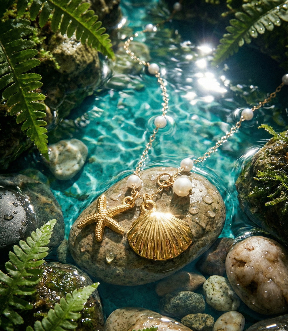 Bring golden coastal vibes to your style with the Ocean Charm Necklace in gold. Crafted from titanium steel, this shell-shaped necklace features a delicate gold-toned chain adorned with pearl-like beads and ocean-inspired charms, including a starfish and scallop shell. Lightweight yet durable, it’s the perfect piece to layer or wear solo for a breezy, beach-inspired look.