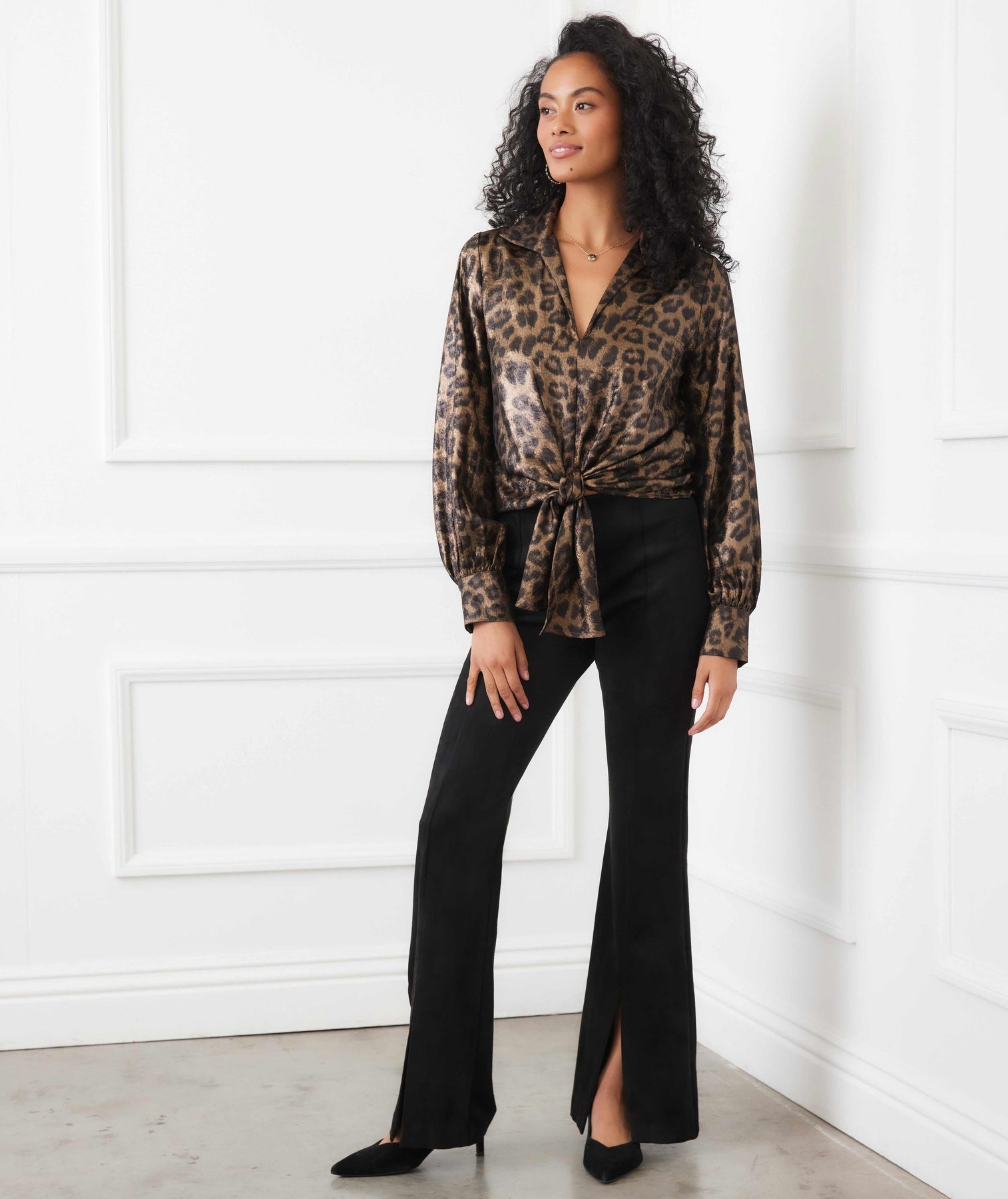 This long sleeve top is crafted from a shimmer animal woven print that adds a luxe, eye-catching finish. Featuring a plunging V-neckline, structured collar, and an adjustable tie-front detail, it’s a polished piece with bold personality—perfect for dressing up or down. Finished with buttoned cuffs and subtle gathering at the wrists for added shape and sophistication.