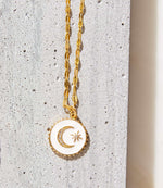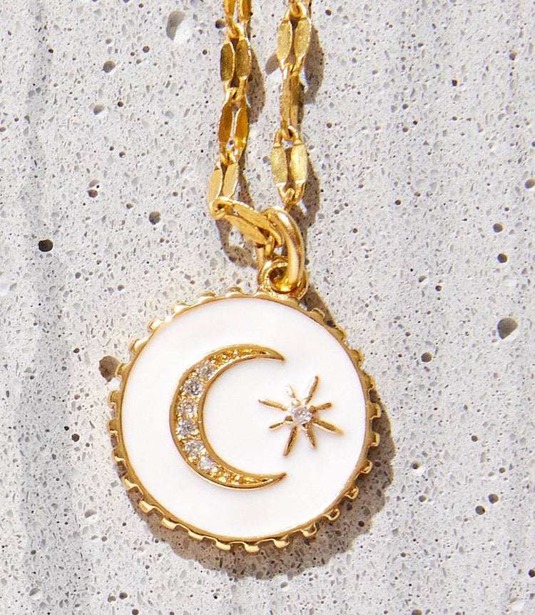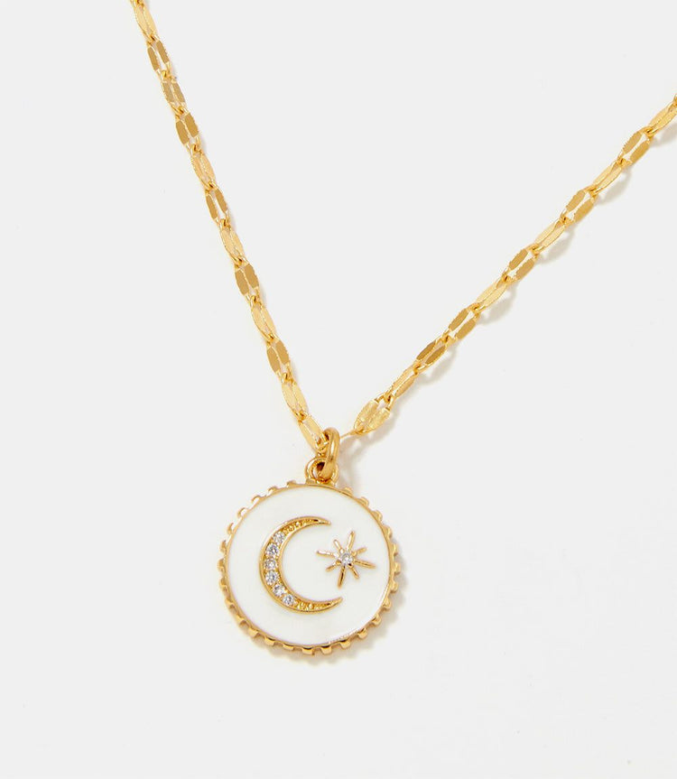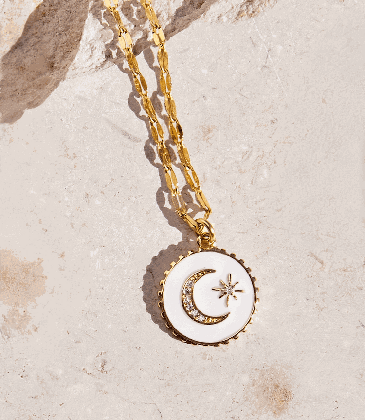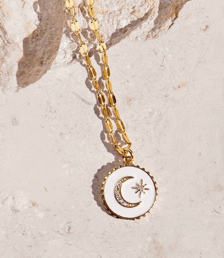 Featuring a gold chain and a charming white enamel moon and star pendant, this necklace radiates elegance and celestial beauty. Perfect for adding a touch of whimsy to any outfit.