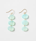 Close-up of woman wearing tiered aqua gemstone earrings with gold and silver accents