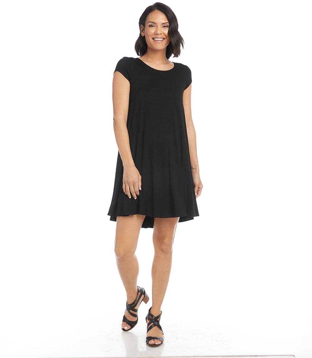An effortless everyday essential, this dress features a scoop neck, cap sleeves, and a breezy trapeze silhouette that drapes beautifully. Crafted from soft, stretchy rayon spandex jersey, it’s finished with a soft high-low hem for subtle shape and movement.