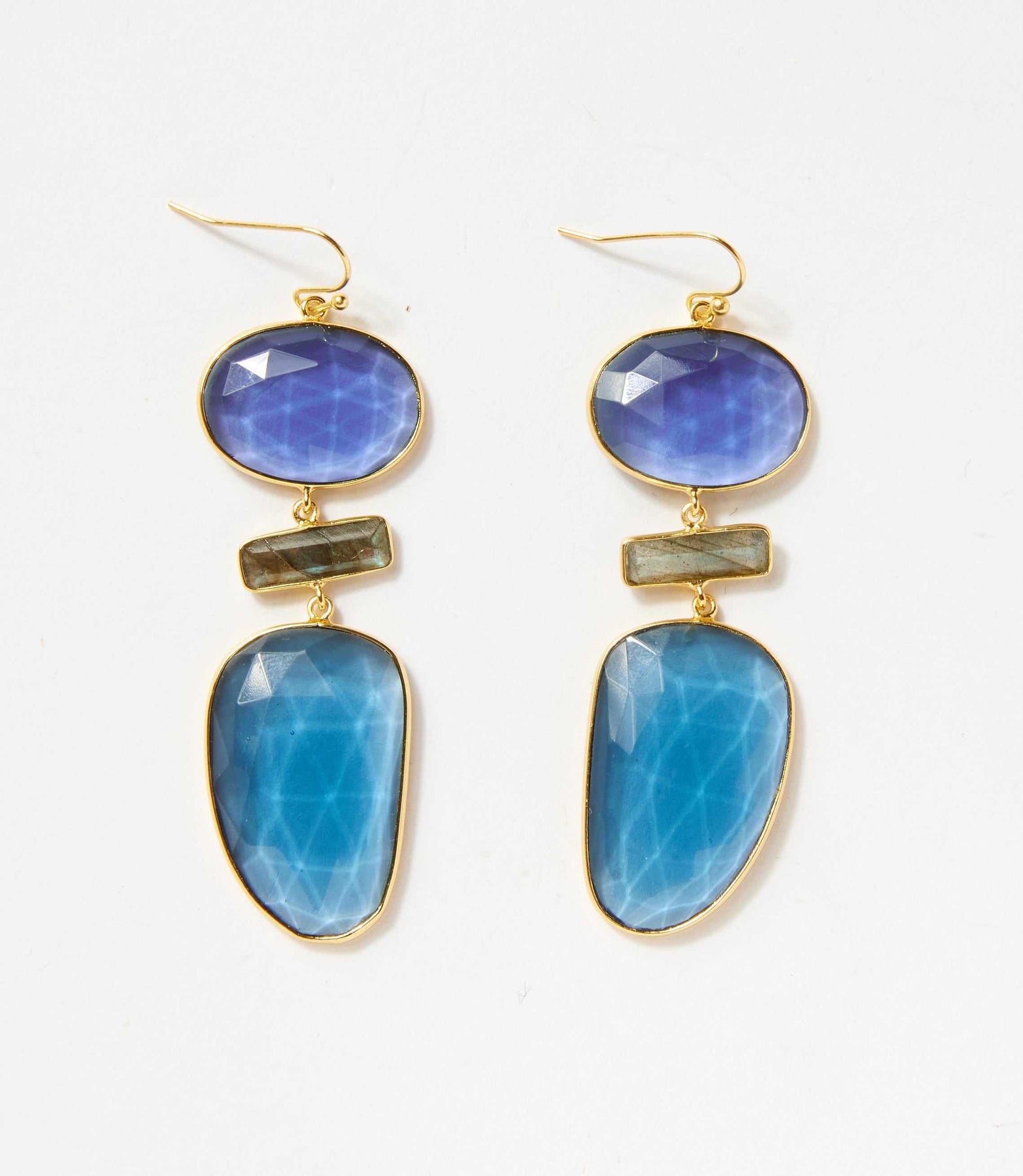 These organic gemstone statement earrings feature striking blue iolite and labradorite. With their natural and unique patterns, they add a touch of elegance to any outfit. Made from high-quality materials, these earrings are perfect for those who value both style and sustainability.