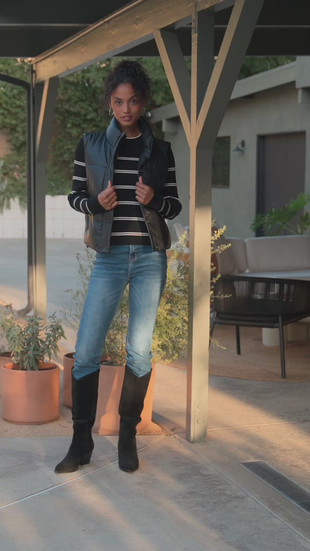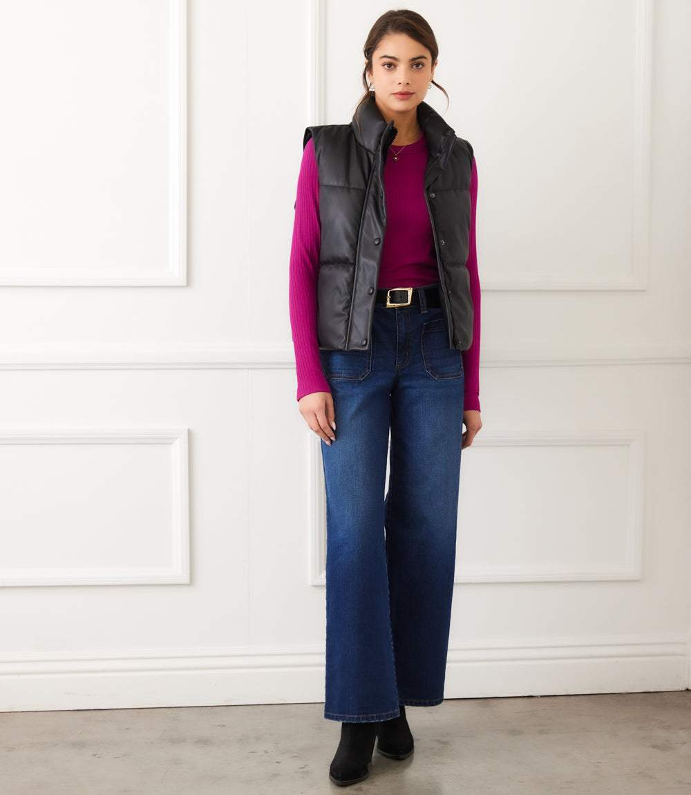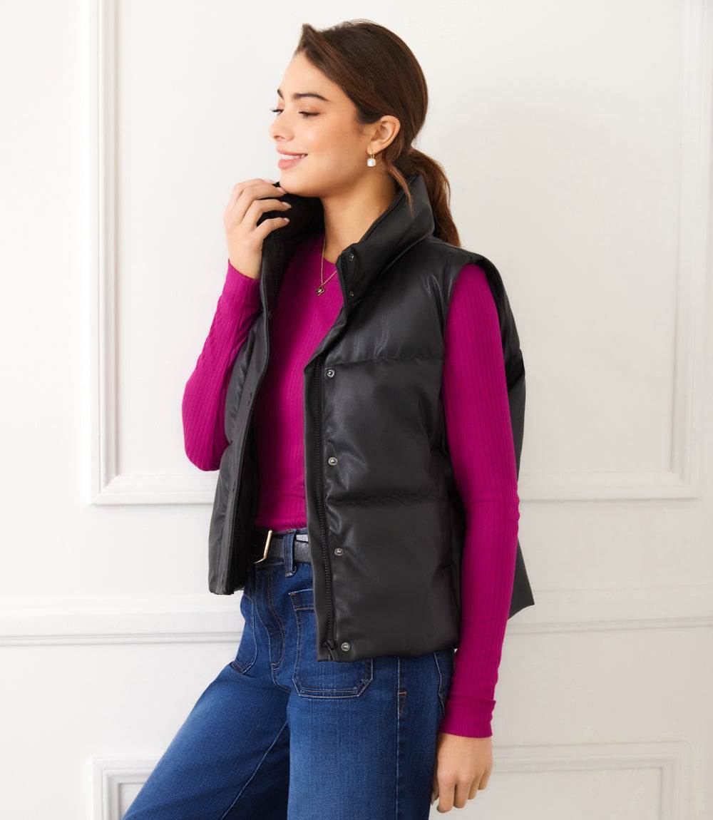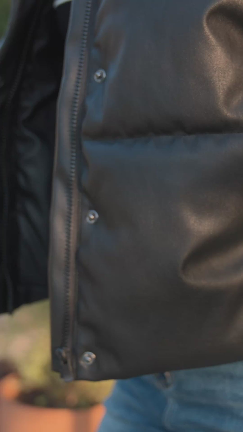 This sleek, quilted puffer vest features a subtle mock neck for added warmth and style. Designed with snap and zipper closure, drawcords at the sides for an adjustable fit, two side pockets, and two interior pockets, it’s the perfect layering piece for both functionality and chic appeal.