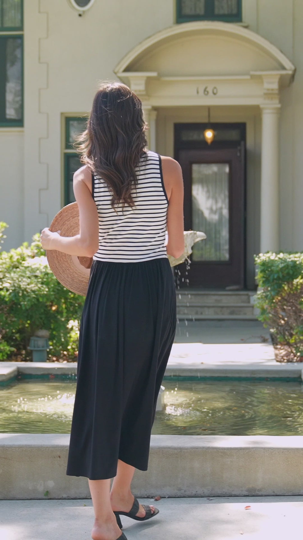 Effortlessly chic and flattering, this sleeveless mixed-media midi dress features a striped knit bodice paired with a flowing solid skirt for a beautifully balanced look. The fitted top enhances the silhouette, while the midi-length skirt adds movement and elegance.
