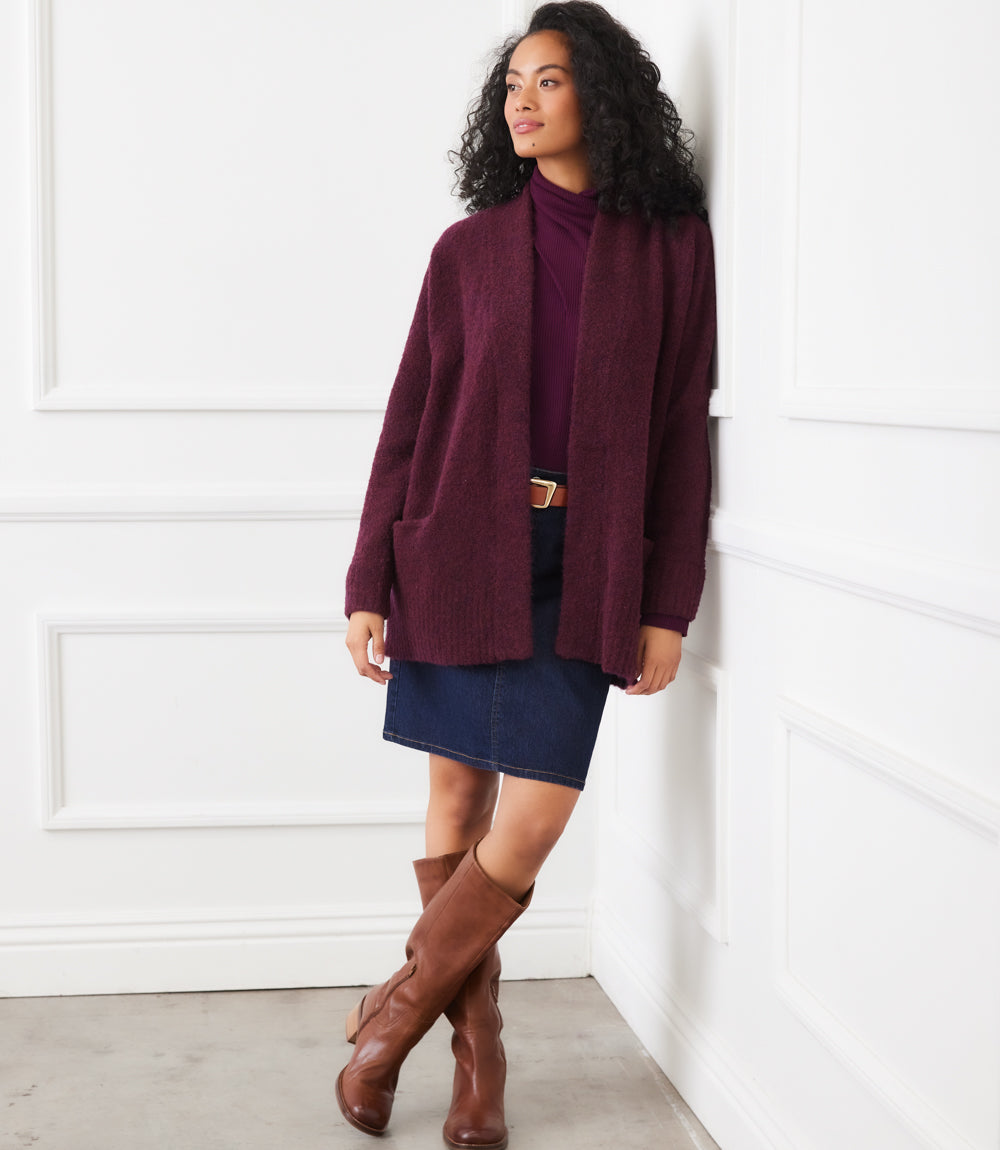 Wrap yourself in cozy texture with this bouclé cardigan sweater. Designed with soft raglan long sleeves for easy movement, it features an open-front design that drapes beautifully around the neckline. Functional front patch pockets add a casual touch. Made with a hint of minimal wool for lightweight warmth, it’s the perfect layering piece for effortless style.