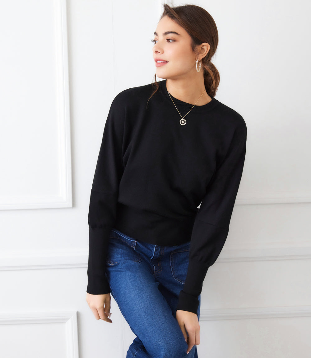Designed with a crew neckline and subtly slouchy silhouette, it features dolman sleeves that taper at the wrists for a soft, draped shape. Ribbed trim at the cuffs and hem adds structure, while the relaxed fit makes it perfect for effortless layering from weekday to weekend.