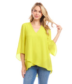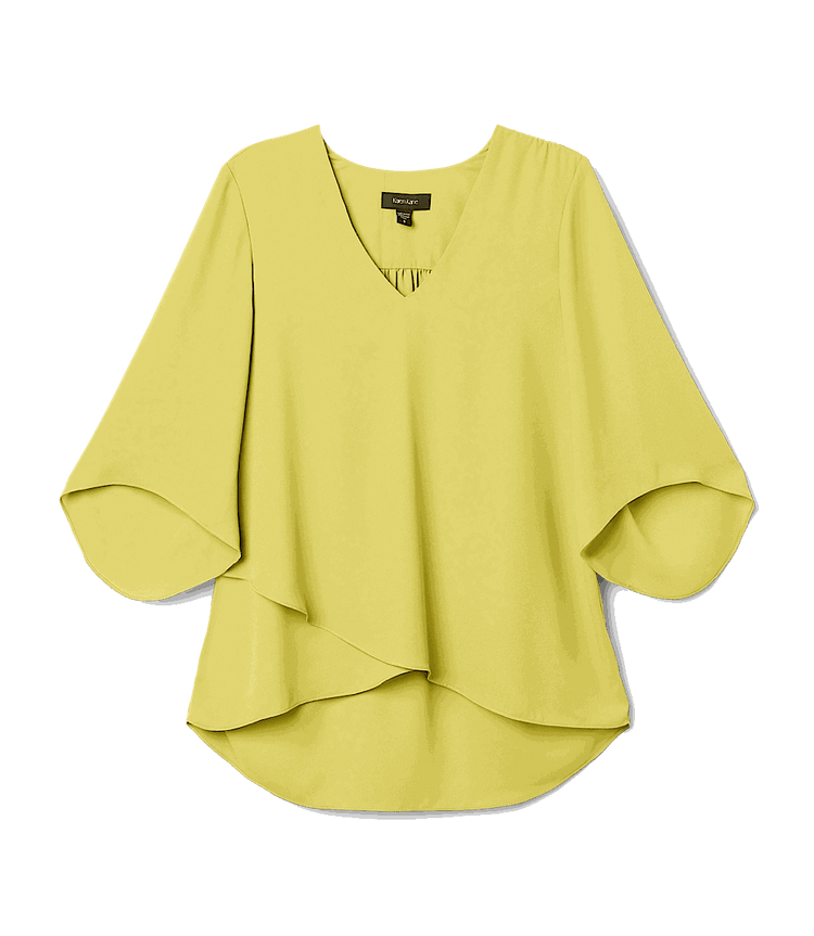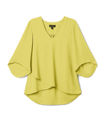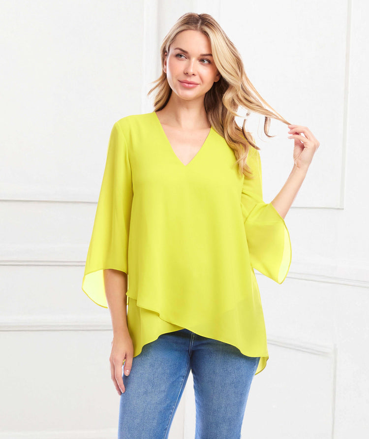 Woman wearing yellow Bracelet Sleeve Asymmetric Top with v-neck and layered asymmetrical hem outdoors