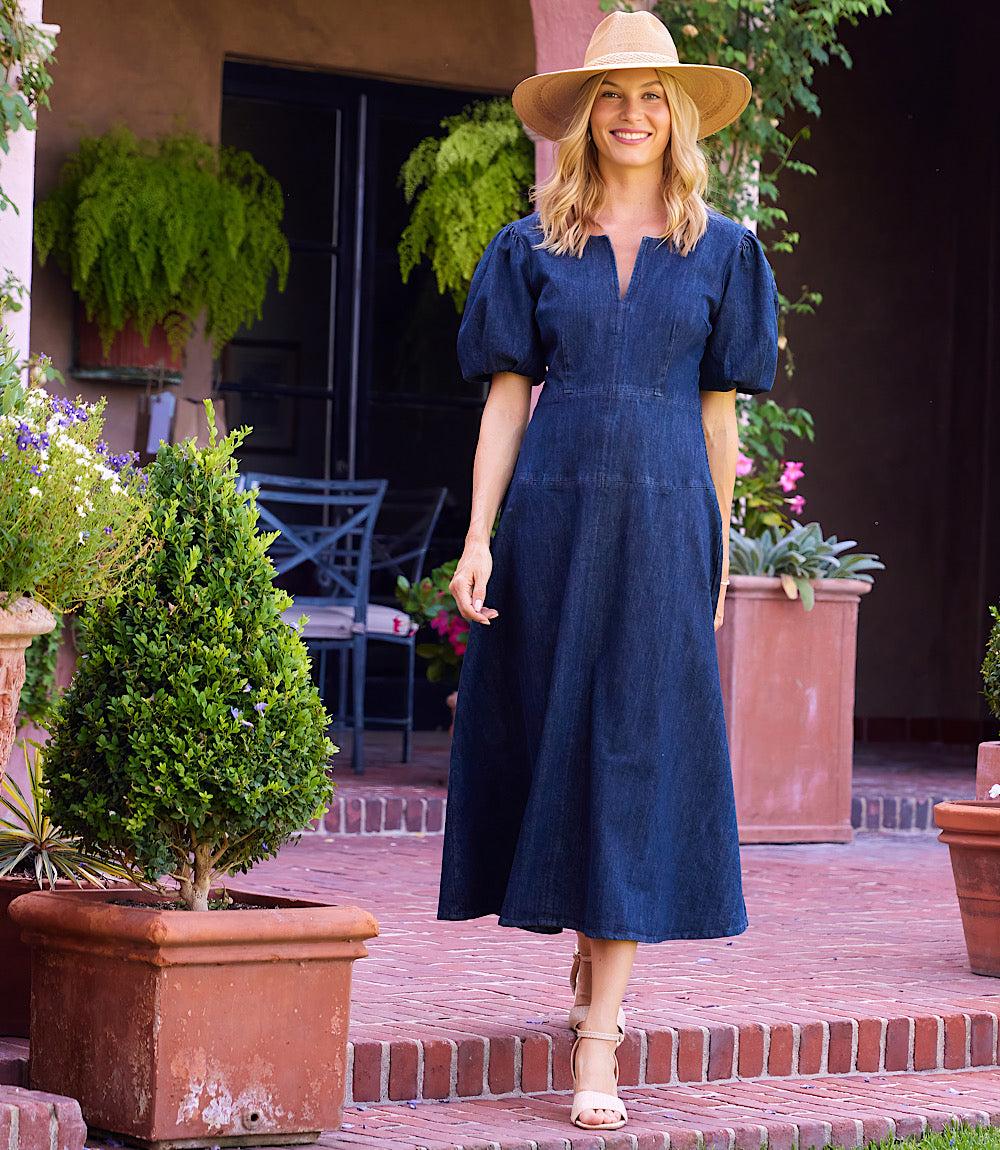 Designed with gathered shoulders and elasticized puff sleeves for soft volume, plus supportive bust darts for shaping, this dress falls to a refined midi length. A back zipper closure ensures a smooth fit, while visible waist and skirt panel seams add subtle structure and contour the silhouette for an effortlessly polished look.