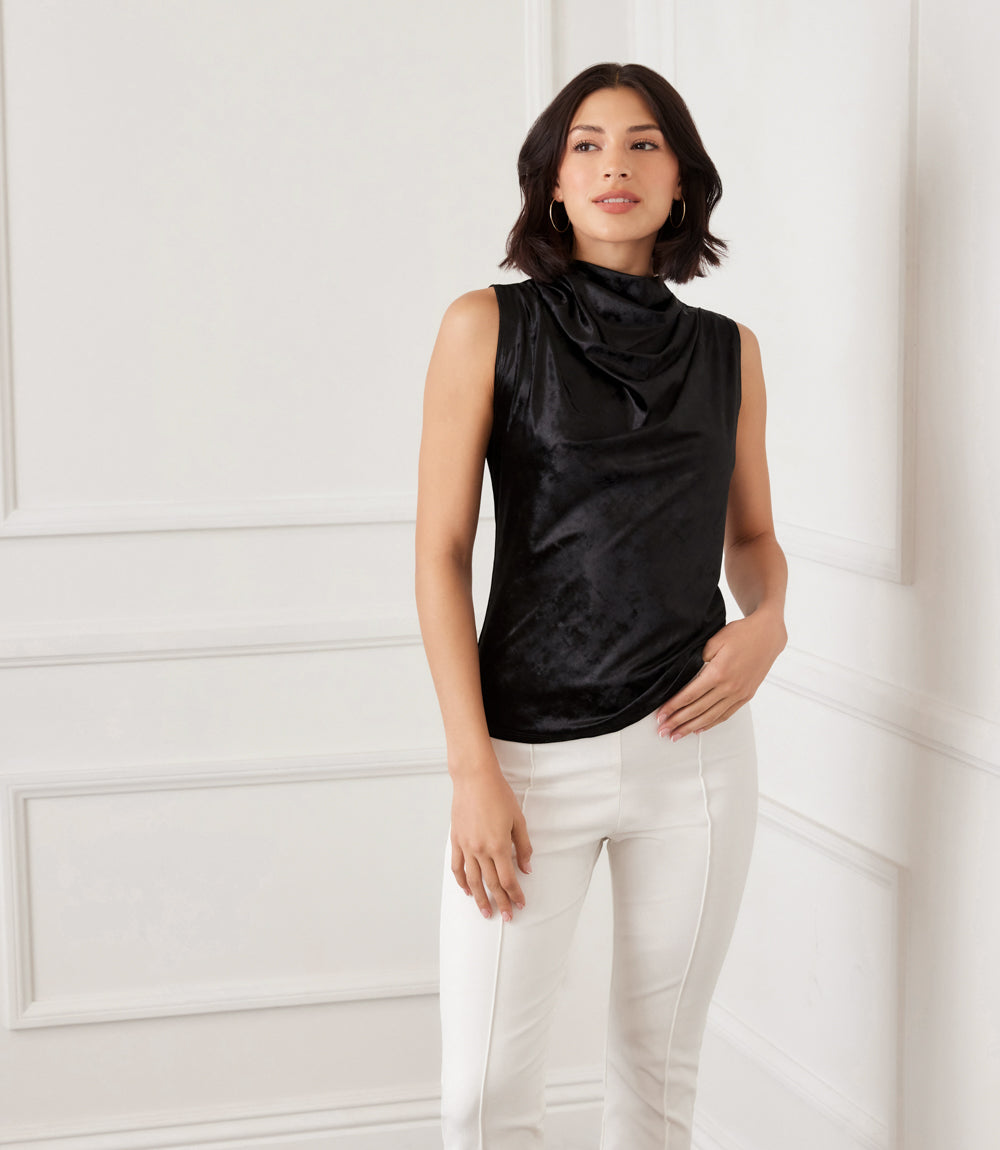 Elegant yet versatile, this top is crafted from stretch crushed velvet for a rich texture and comfortable fit. The draped front neckline creates a soft, sophisticated effect, complemented by the sleeveless silhouette for effortless layering. Designed with a mock neck style, it adds modern polish, while the pull-on construction keeps it easy to wear from day to evening.