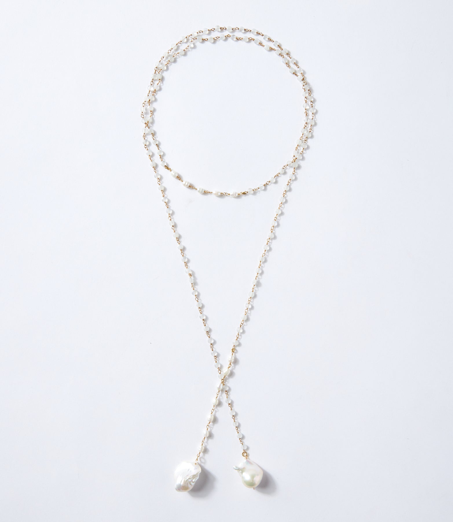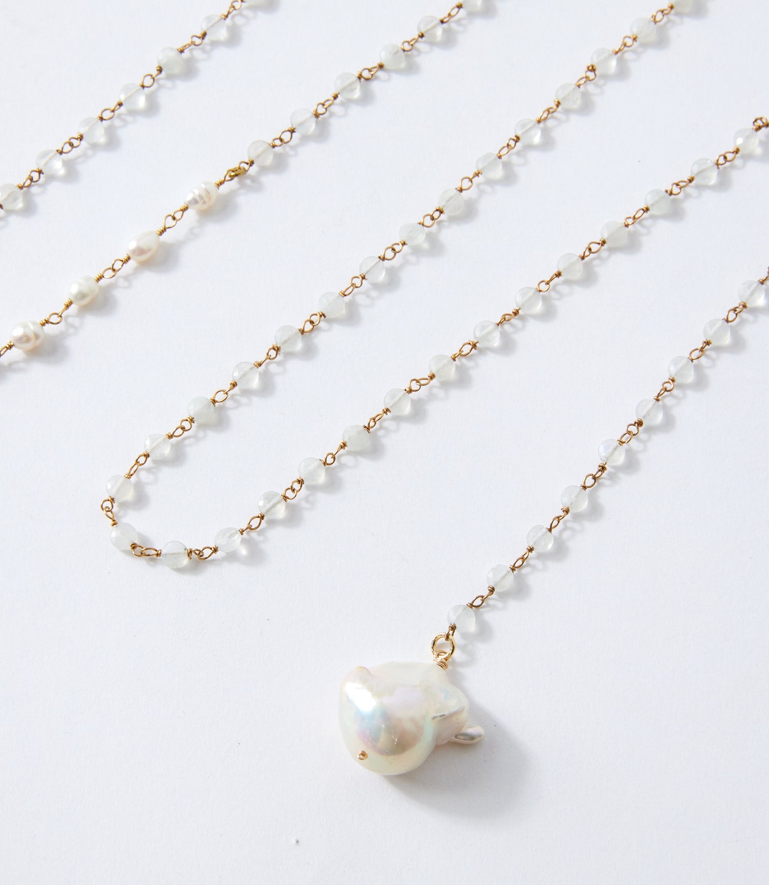 A luminous pairing of glowing moonstone and soft, iridescent mother of pearl, this necklace captures quiet elegance and celestial charm. Designed as a single long strand with no closure, it invites you to wrap it to your desired length—creating a custom, layered look with radiant ease. The natural shimmer of each element creates a harmonious glow, perfect for adding a touch of light to any ensemble.