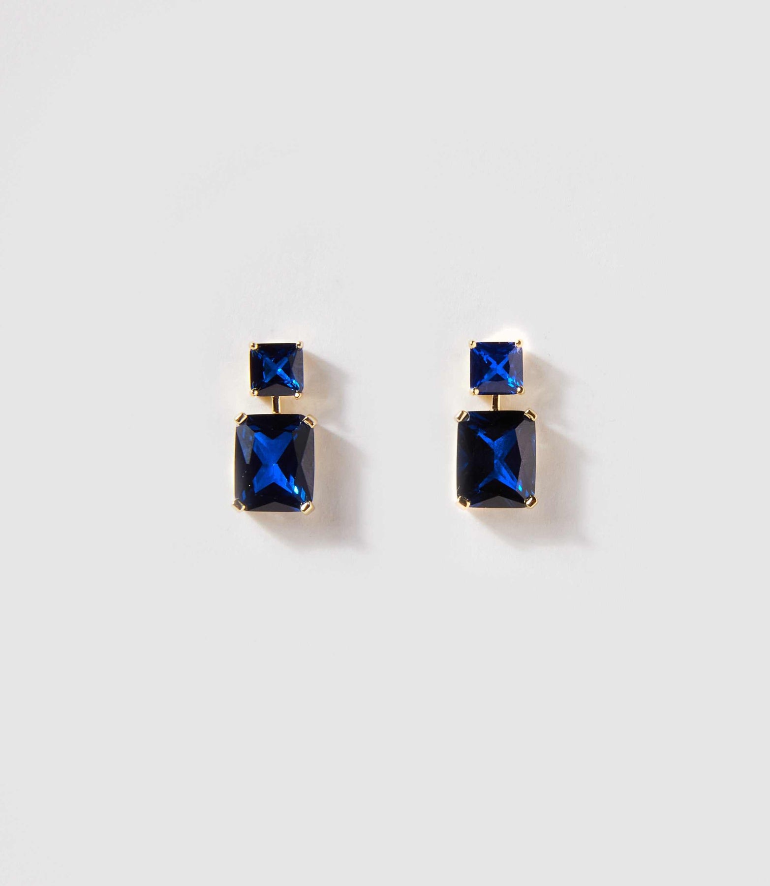 Bold and elegant, these drop earrings feature stacked princess-cut cubic zirconia stones in a rich sapphire blue hue. Set in gold over brass, their clean lines and timeless silhouette make them a striking choice for both everyday glam and special occasions.