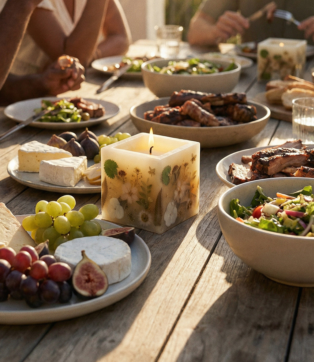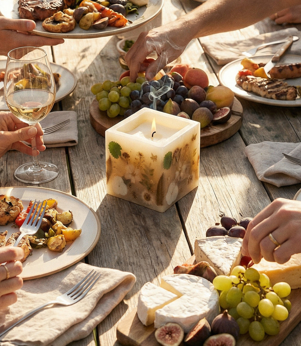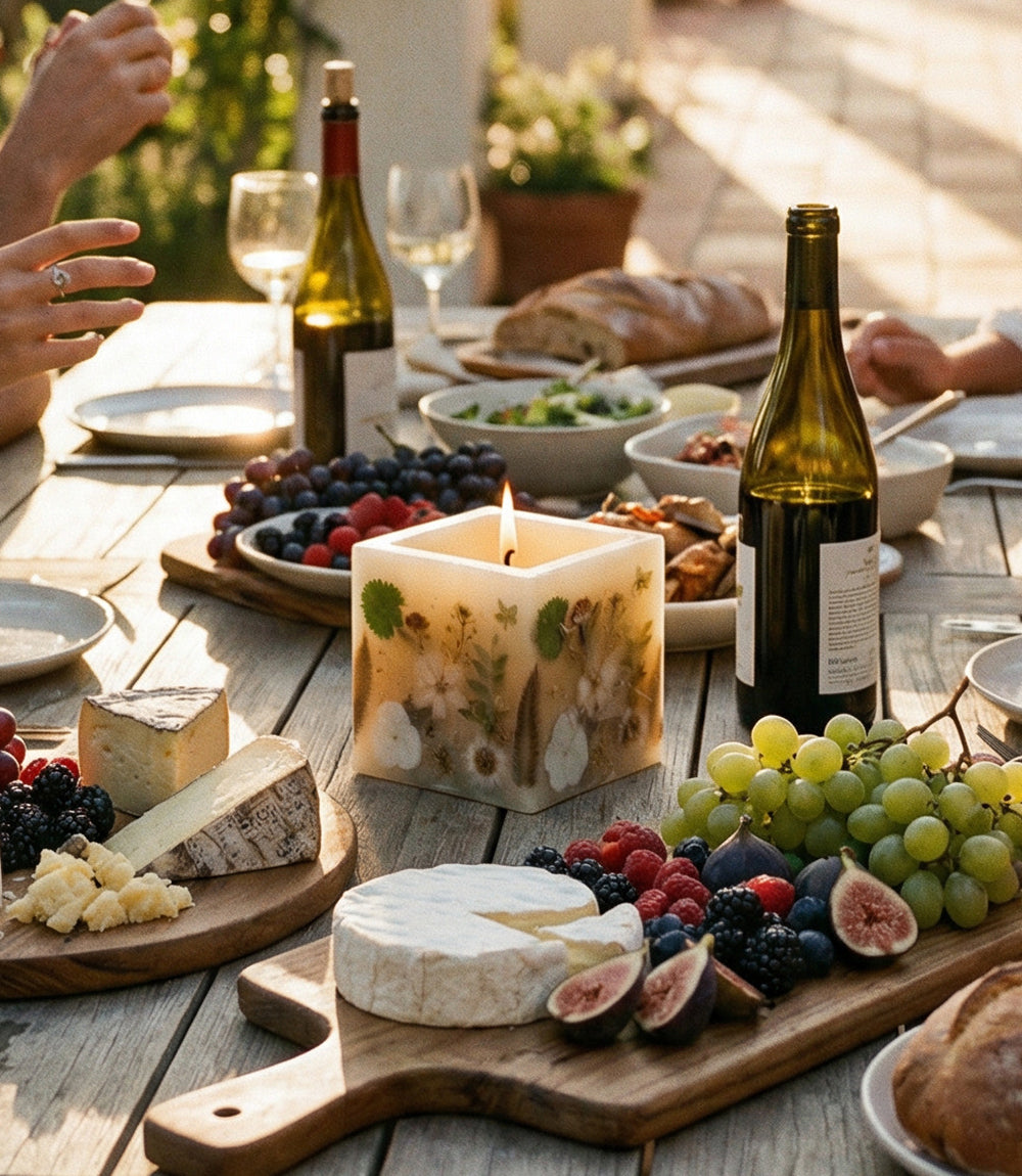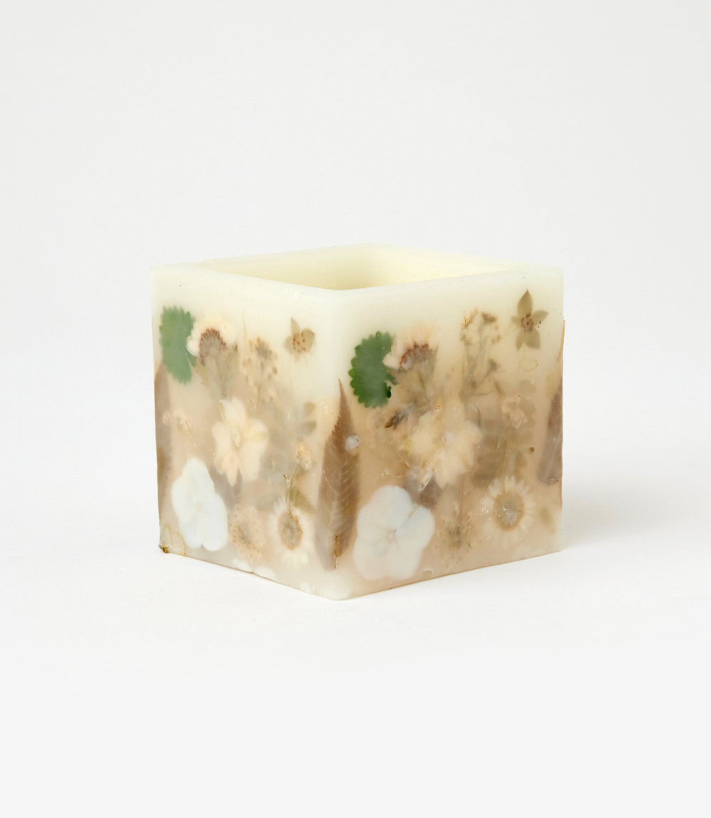 Handcrafted with individually applied pressed flowers, this hurricane-style candle transforms real botanicals into a delicate floral collage. The centerpiece is filled with soy wax and scented with a luxurious blend: bright mandarin peel, orchid, and lemon zest at the top; a heart of black rose, patchouli blooms, and additional orchid notes; and a warm base of cashmere musk, oakwood, and cedarwood. A beautifully artistic candle that brings soft glow, natural charm, and elegant fragrance to any space.