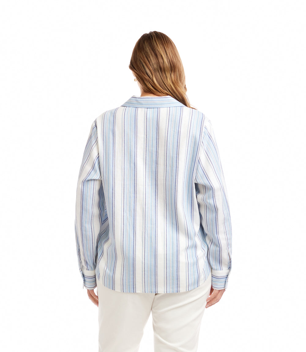 Effortlessly stylish and versatile, this Long Sleeve Eyelet Lace-Up Top is crafted from a soft linen-blend woven fabric that offers a breathable, lightweight feel. Designed with a classic collared neckline and long sleeves with button cuffs, it features a lace-up front with eyelet detailing for a touch of modern charm. The vertical stripe pattern adds a flattering, elongating effect, while the shirt-tail hem provides a polished, easy-to-tuck or untucked finish—perfect for both casual and refined looks.