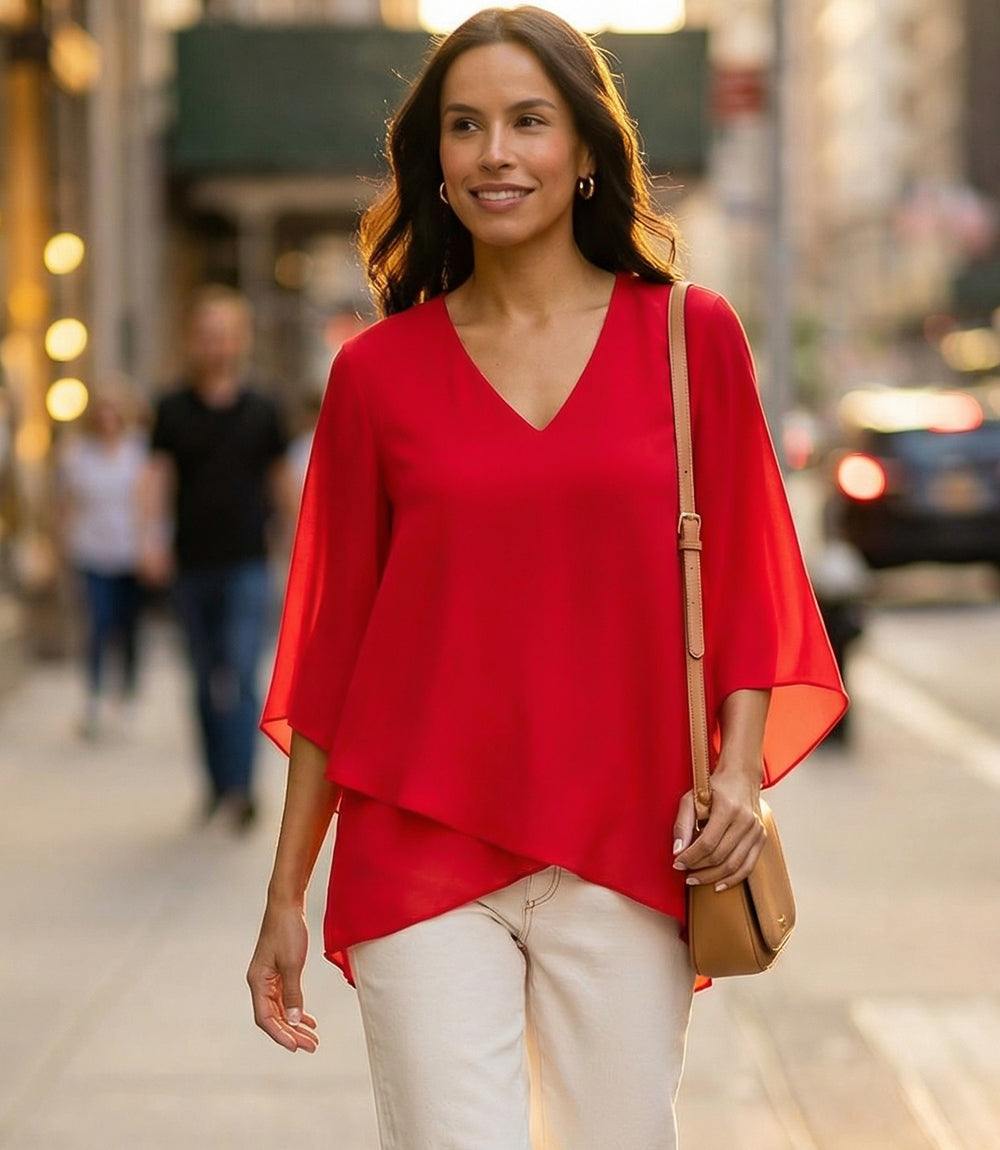 Bracelet Sleeve Asymmetric Top in silky crepe with V-neck, flare sleeves, and layered asymmetrical hem for elegant comfort