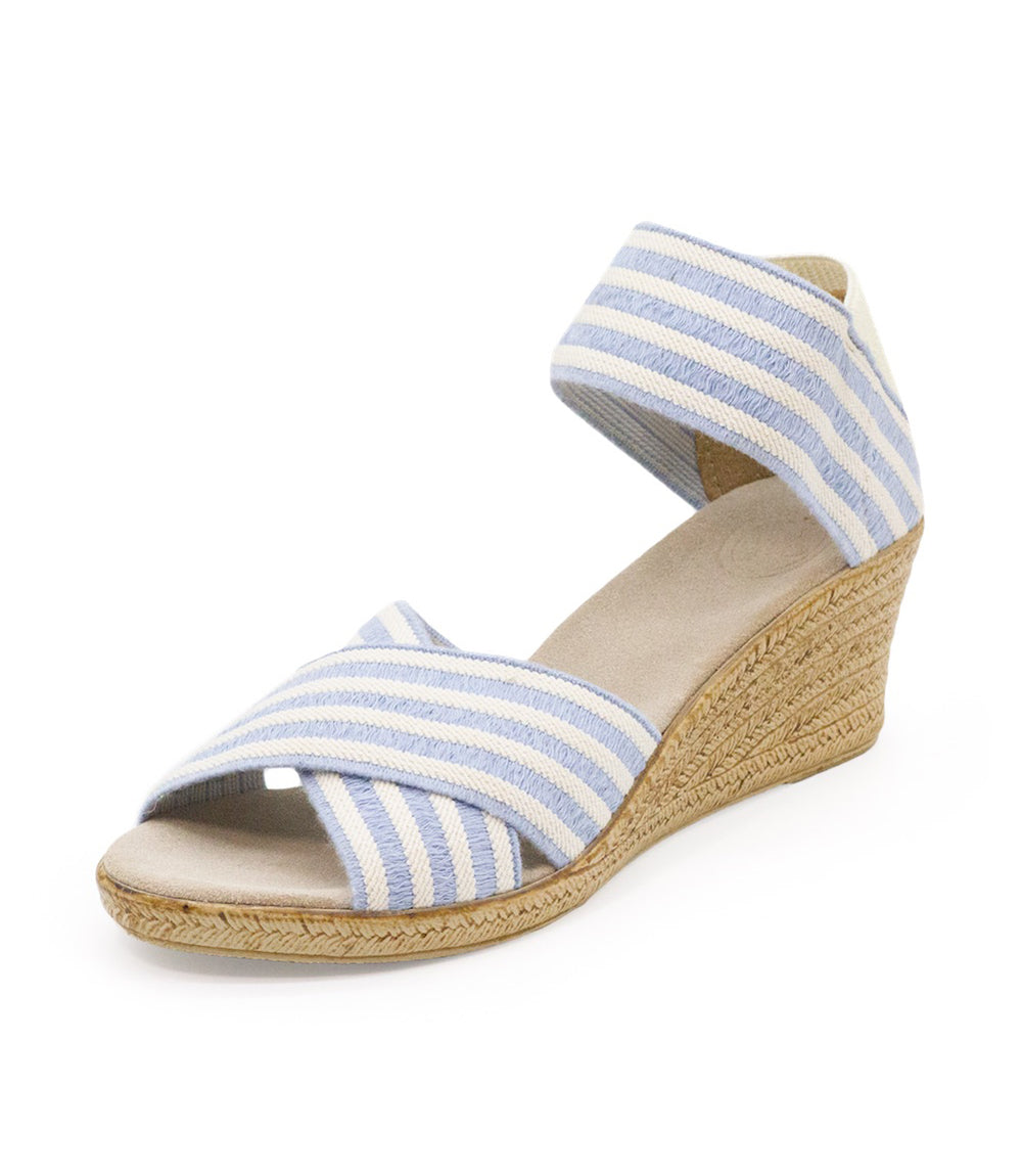 Step into effortless comfort and style with these charming blue striped wedges. Designed with a flexible, stretchy elastic upper and supportive crisscross straps, they move with you for an easy, secure fit. A wide elastic ankle strap adds stability without sacrificing comfort, while the round toe design enhances their relaxed, everyday appeal.