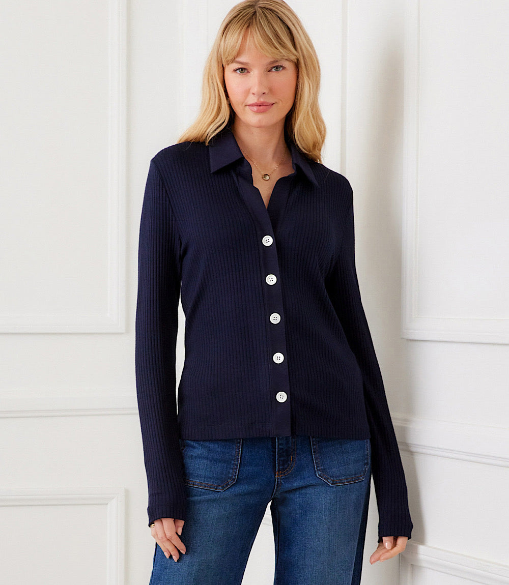 This ribbed long-sleeve top features a contrast shirt collar, full button-front closure, and a sleek, stretchy knit that creates a smooth, refined silhouette—perfect worn alone or layered.