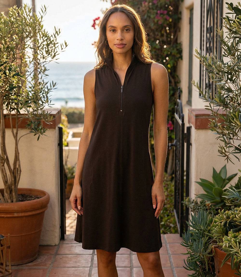 As featured in Travel & Leisure Magazine as the best wrinkle-resistant dress of 2025, this stretchy, versatile, and breathable dress is the perfect go-to travel dress. Made from soft, wrinkle-resistant travel jersey, it features a sleek half-zip front with a collar that can be worn up or folded down, functional side pockets, and an above-the-knee, breezy silhouette ideal for sightseeing or weekend strolls. The Karen Kane Travel Half Zip Shift Dress checks every box: it’s comfortable, lightweight, and designed with a refined zipper detail that gives it a sporty yet elegant look. The adjustable high neckline offers styling versatility—zip it up for coverage or unzip it for airflow or a layered pop of color. It also transitions seamlessly into fall with a blazer, long sleeves, or tights. It’s also featured in black and navy.