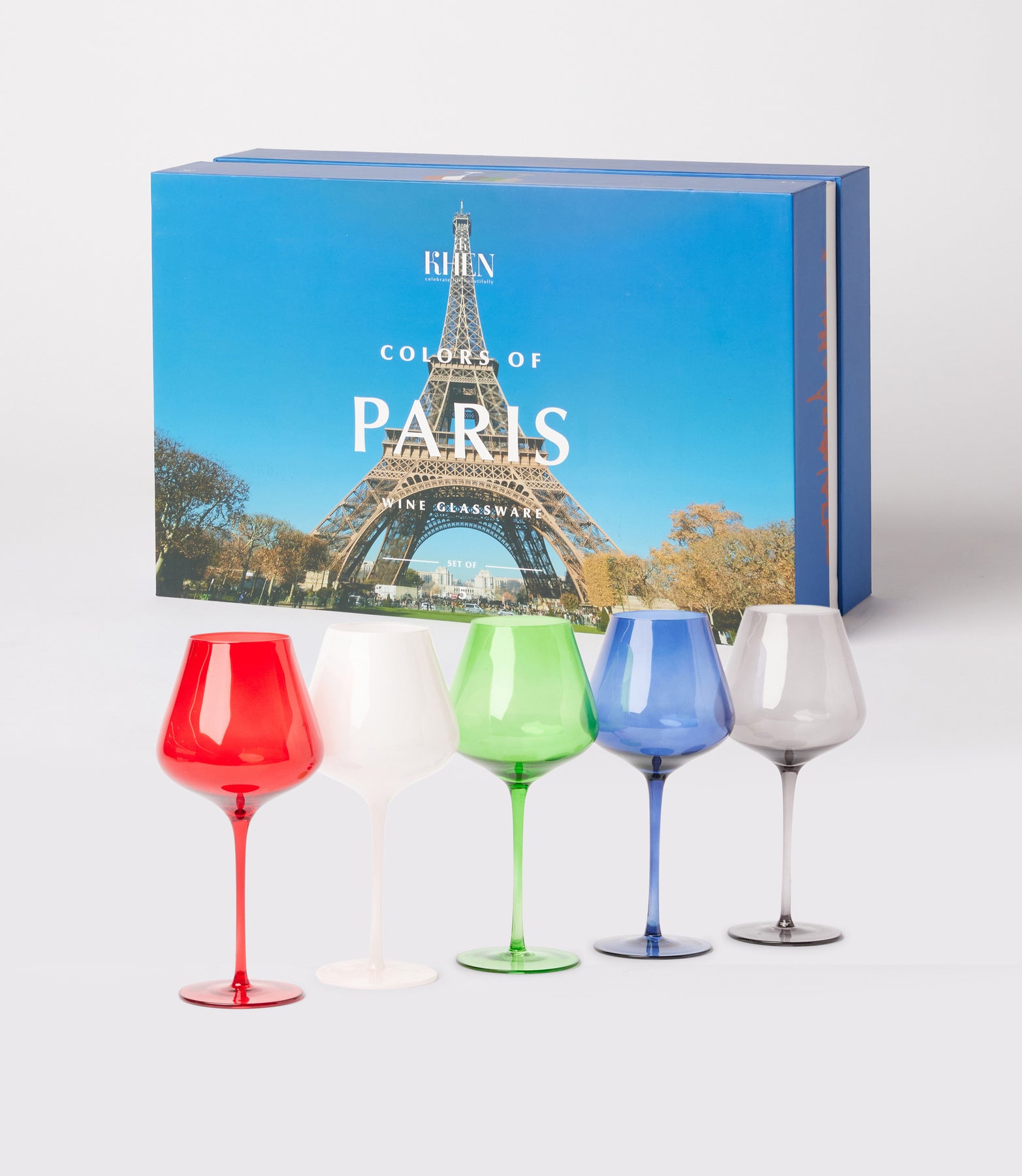 Celebrate the elegance and charm of Paris with this set of five wine glasses in sophisticated hues — red, white, green, blue, and gray. Perfect for entertaining or gifting, these colorful glasses bring a chic, cosmopolitan touch to your table while evoking the timeless beauty of the City of Light.
