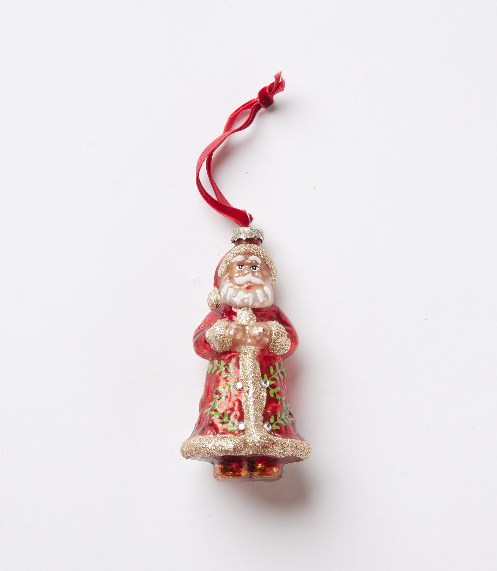 Crafted in glass, this jolly Santa wears a vibrant red coat adorned with festive floral detailing and shimmering glitter accents. Suspended from a red ribbon for easy hanging, it’s a timeless piece that adds warmth and sparkle to your Christmas tree.