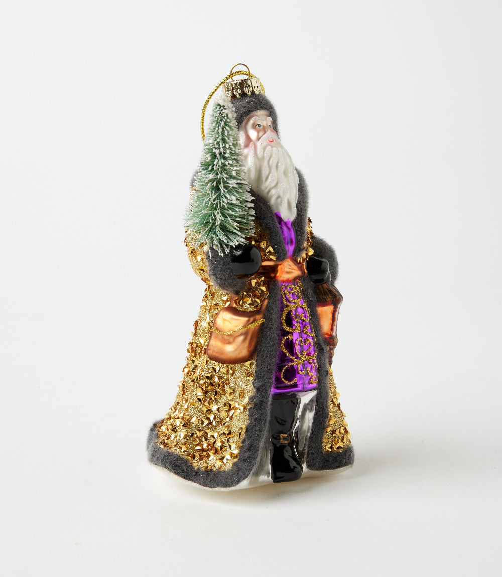 Illuminate your holiday décor with the Lighting The Way Santa Glass Ornament. Expertly crafted from glass, this elegant ornament features Santa in a richly detailed gold and purple robe, holding a lantern and evergreen tree.