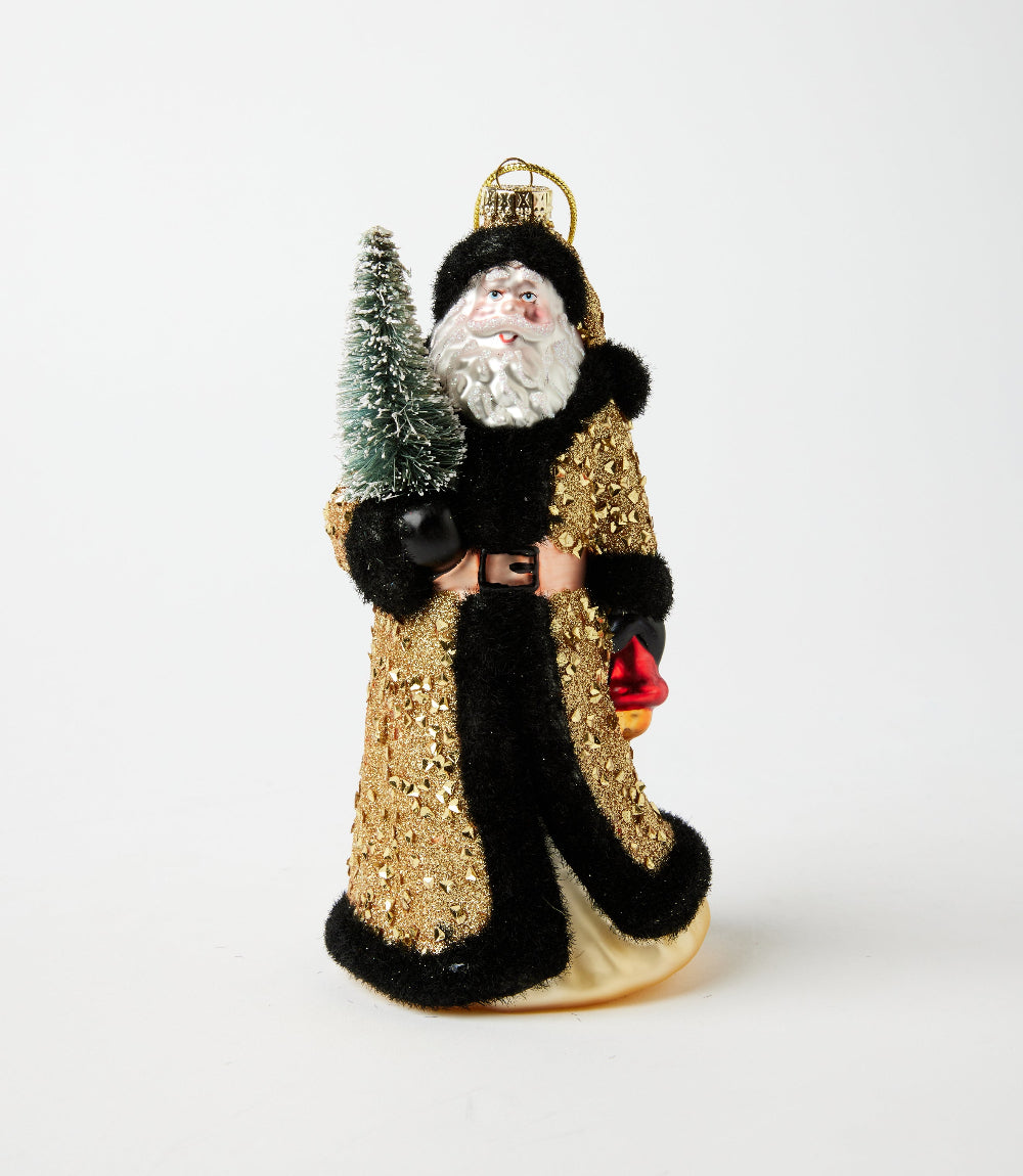 Bring vintage holiday charm to your tree with the Through The Woods Santa Glass Ornament. Crafted from glass, this elegant piece features Santa in a shimmering gold and black coat, holding a tiny evergreen tree and red lantern.