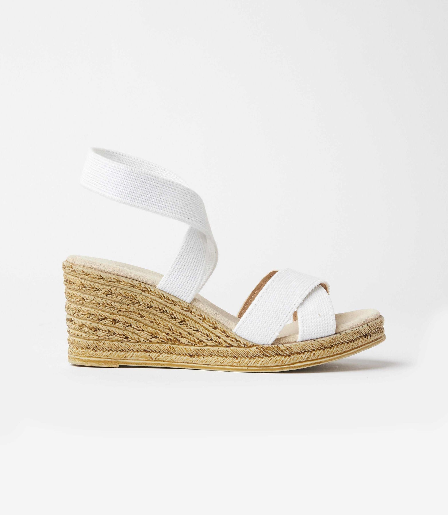The Fishburne Criss Cross Faux Espadrille Wedge Sandals combine classic design with modern comfort and ease. Made with crisp white linen, these sandals feature wide criss-cross straps and lined toe straps for a clean, structured look. The all-stretch ankle strap offers a secure, slip-on fit with no buckles needed. Set on a faux espadrille wedge, painted for a more refined, durable finish, they deliver the relaxed style of traditional espadrilles with a polished touch.