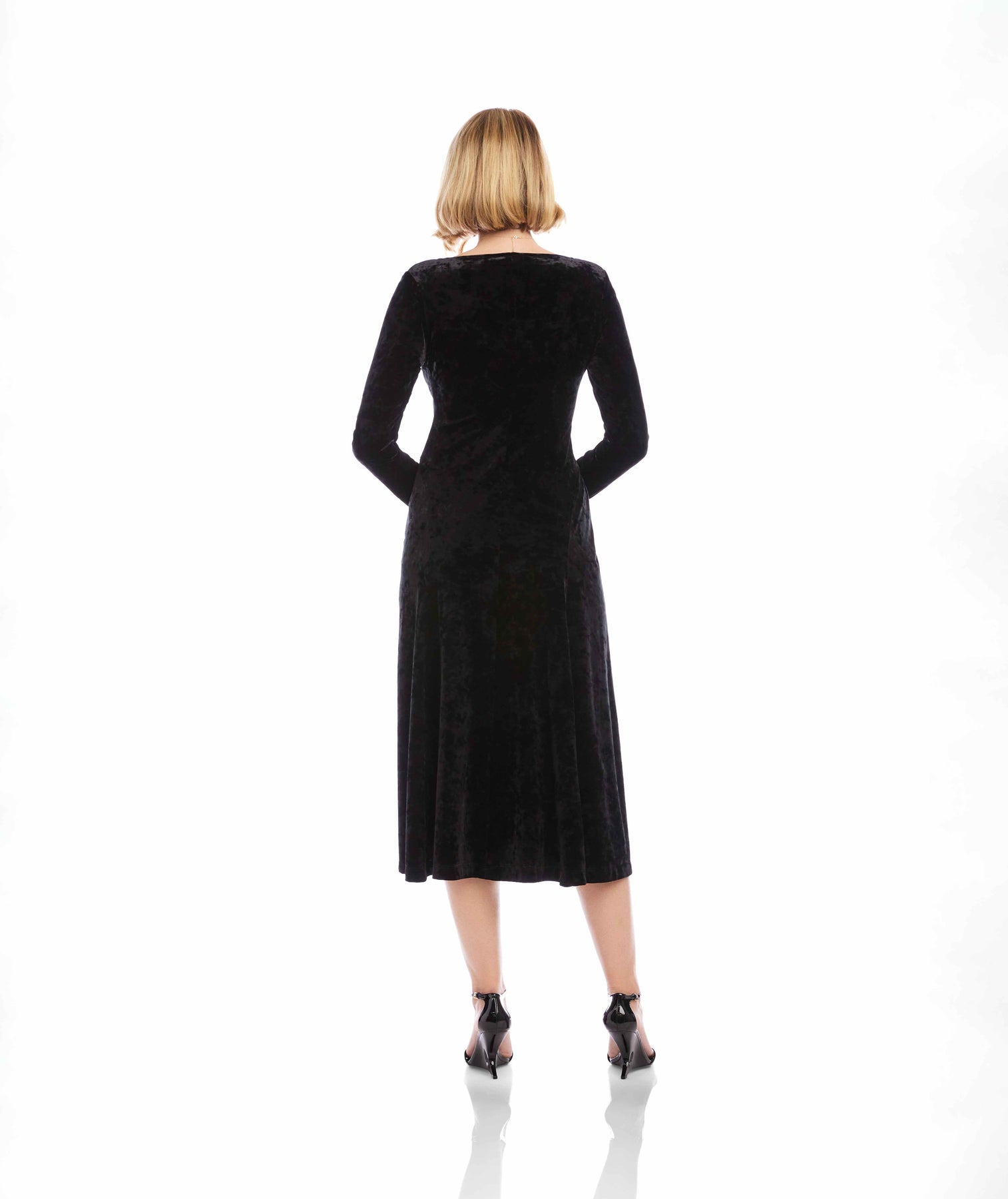 Crafted from stretched crushed velvet, this pull-on midi dress combines comfort with elegance. Designed with a slim, body-skimming fit that gently flares toward the hem, it gives the illusion of an A-line silhouette. The long sleeves and midi length create a timeless look that’s versatile for both day and evening wear.