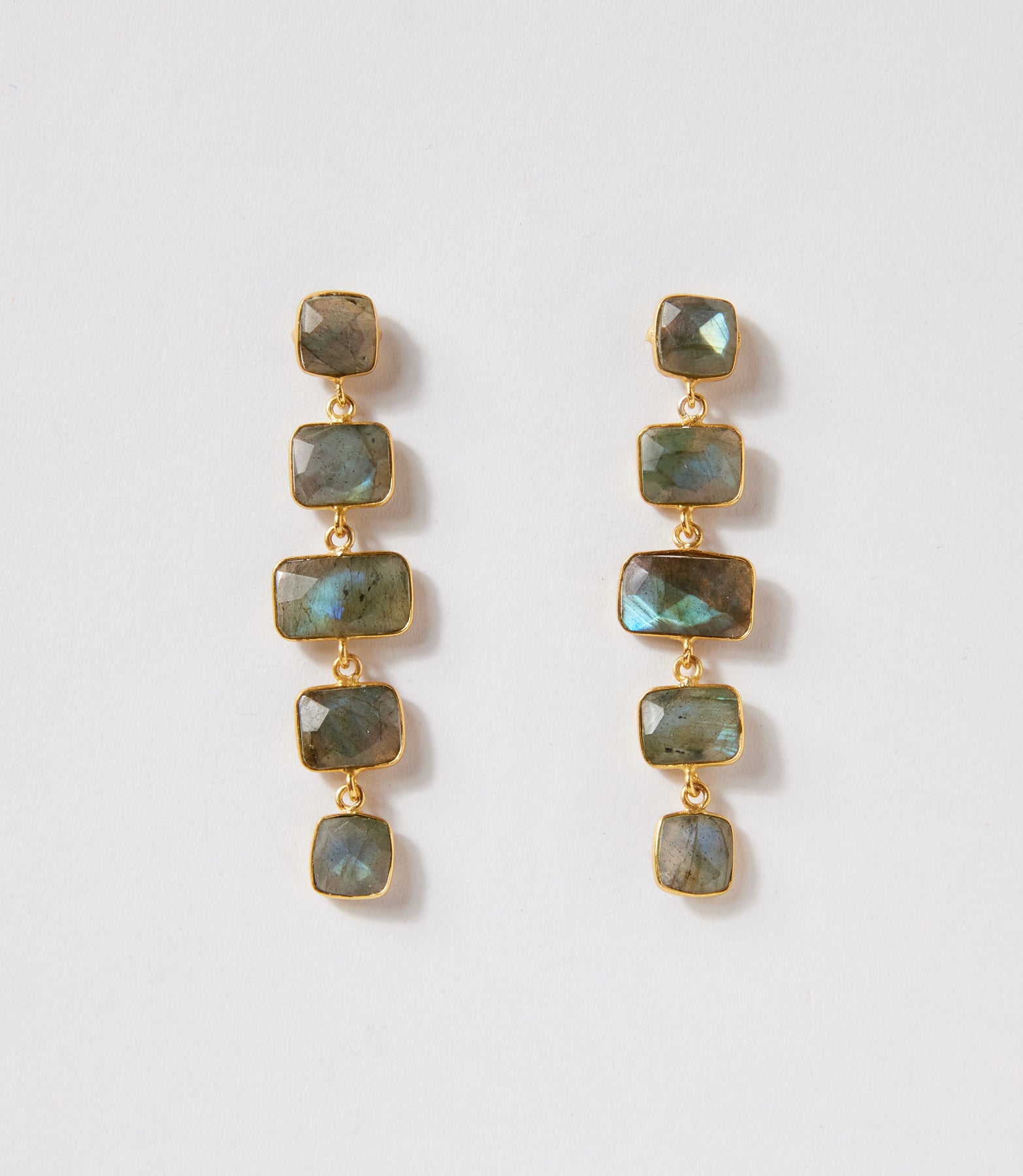 Featuring five stunning labradorite gemstones, each stone boasts its signature iridescent flashes of blue, green, and gold, creating a mesmerizing effect with every movement. The elegant drop design cascades gracefully, with each stone carefully set to highlight its natural beauty and unique color play.