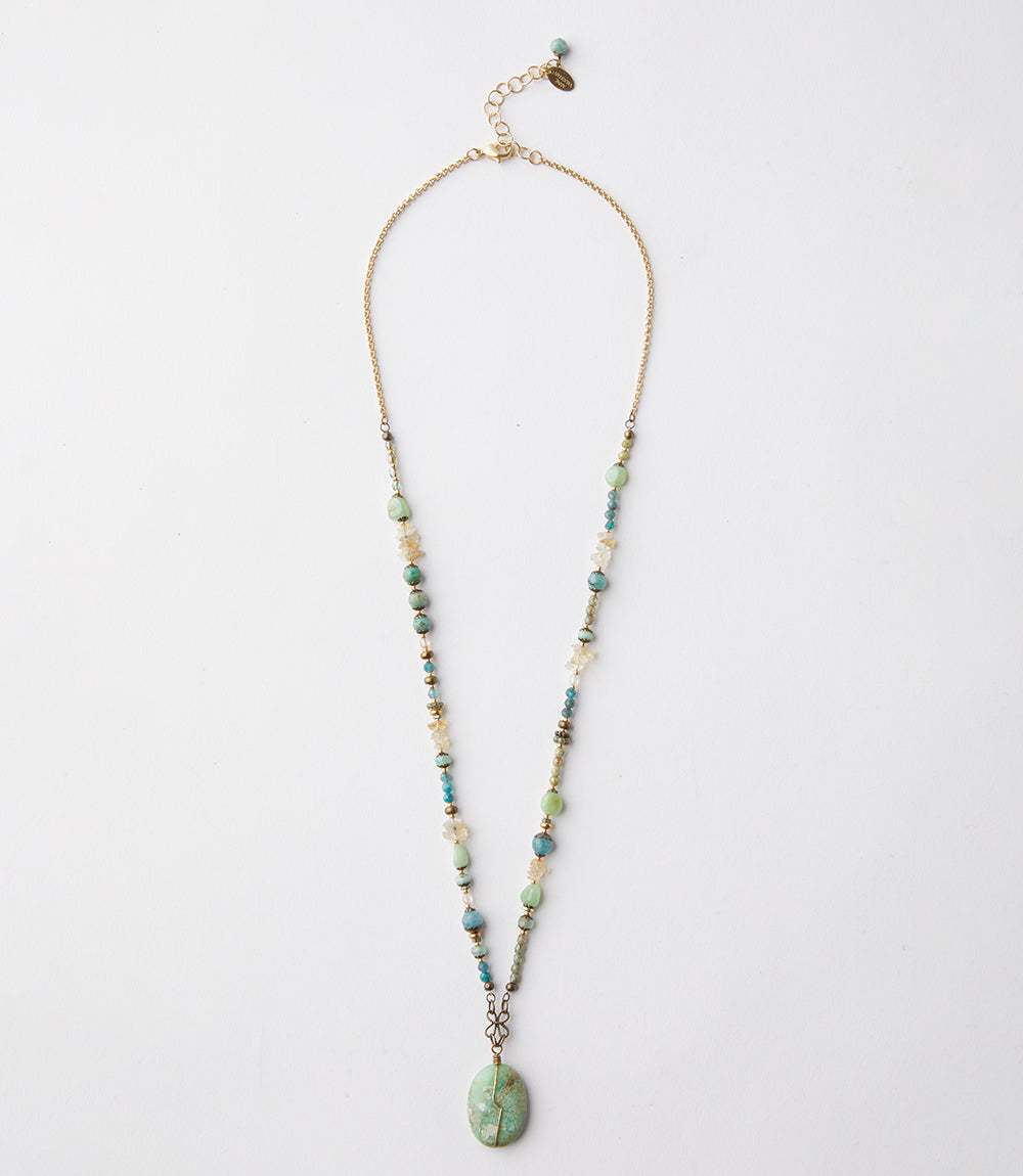 This handcrafted necklace is made of an assortment of earth-toned stones, accented with brilliant shades of aqua and mint.