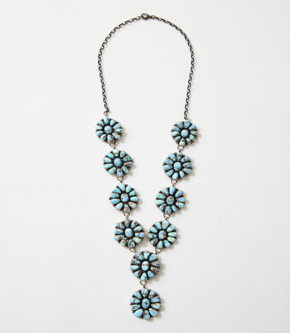 This sterling silver necklace showcases stunning Golden Hill turquoise clusters, each stone selected for its soft blue tones and natural matrix. The handcrafted clusters are arranged in a cascading design that draws the eye downward, creating a beautifully flowing and impactful statement piece. Navajo-handmade with exceptional artistry, the necklace is finished with a secure lobster-claw closure for comfortable, everyday wear.