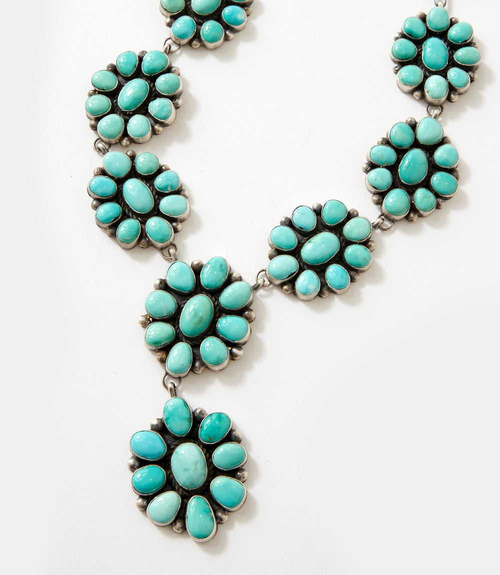 This sterling silver necklace and earrings set showcases striking Lone Mountain turquoise stones arranged in beautifully crafted cluster designs. The necklace features a cascading layout that draws the eye downward, with each link expertly welded together for added strength and lasting durability. It is finished with a secure lobster-claw closure for easy, comfortable wear. The matching earrings echo the same vibrant turquoise and artisan detail, designed with classic hook ear wires for a graceful, lightweight fit.
