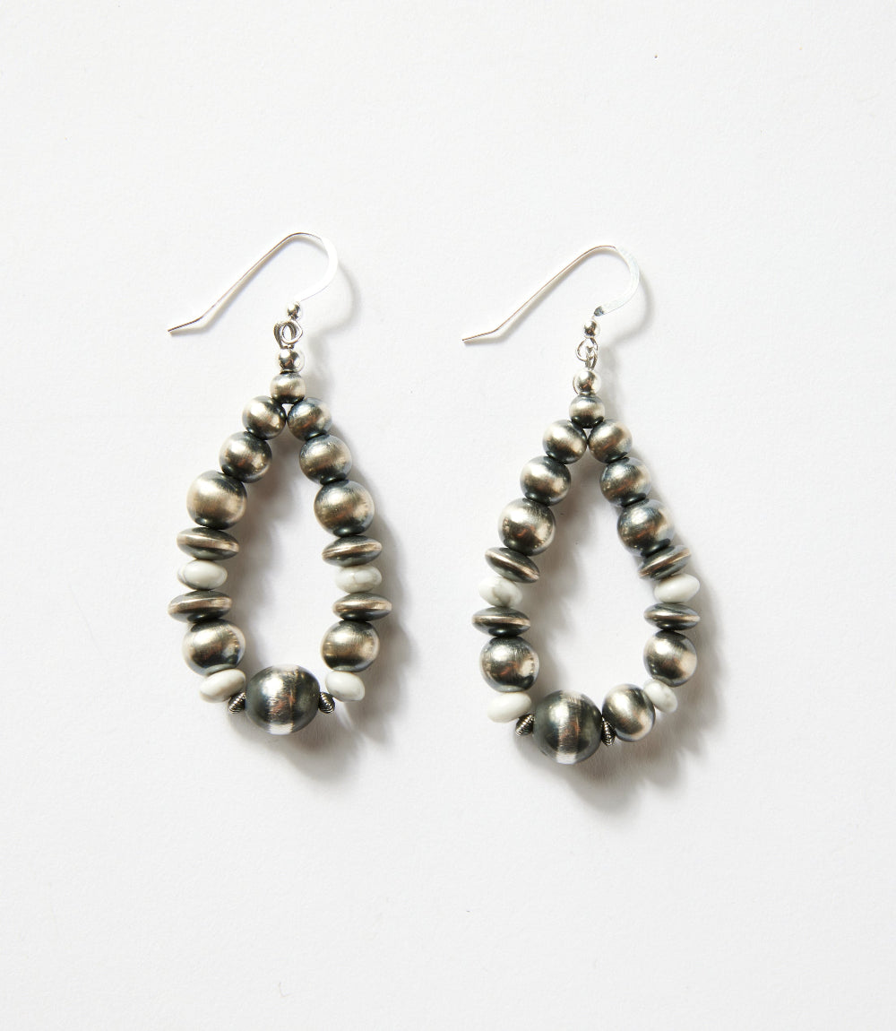 This handcrafted set features a striking White Buffalo heart pendant, showcasing its signature black-and-white matrix, paired with a strand of classic Navajo pearls in graduated sizes. The matching earrings, designed with the same oxidized silver beads, hang from comfortable hook-style ear wires for easy wear.