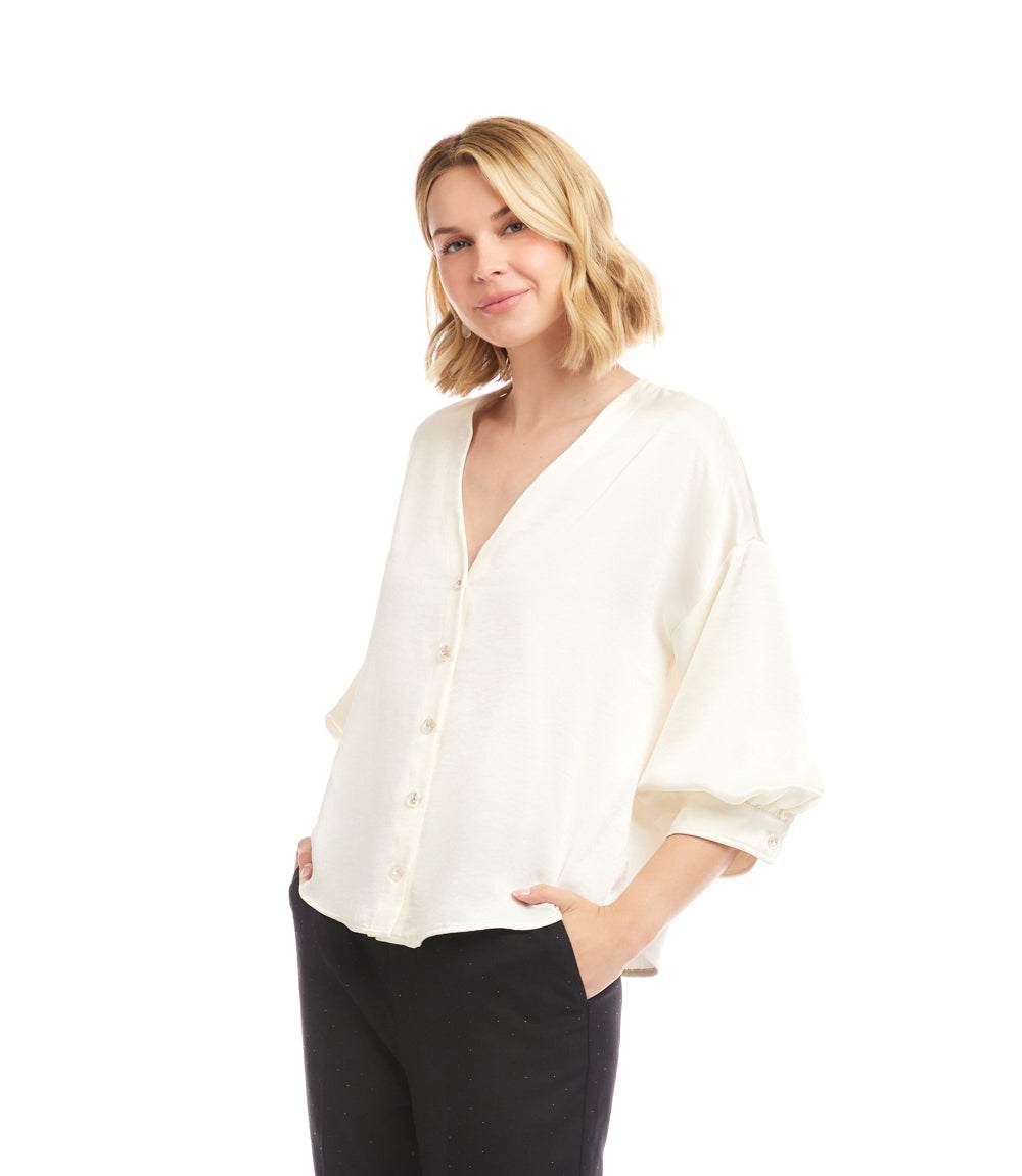 Feminine elegance with a touch of sparkle. This satin blouse features 3/4 length lantern sleeves and a flattering V-neckline. The button-front design is elevated with shimmering rhinestone buttons, while the sleeve cuffs are also finished with button closures for a refined detail.