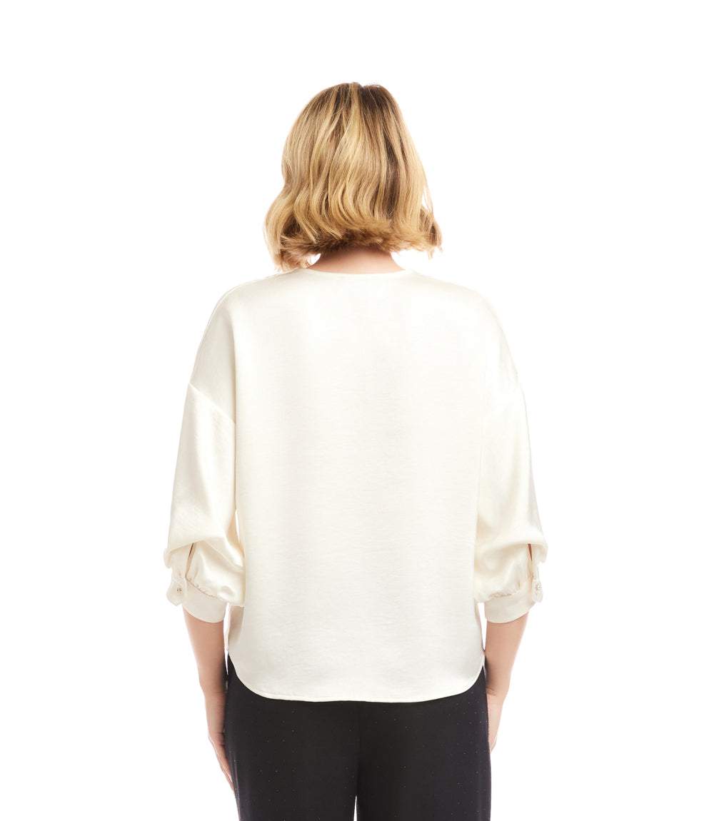 Lantern Sleeve Crystal Rhinestone Button Satin Top