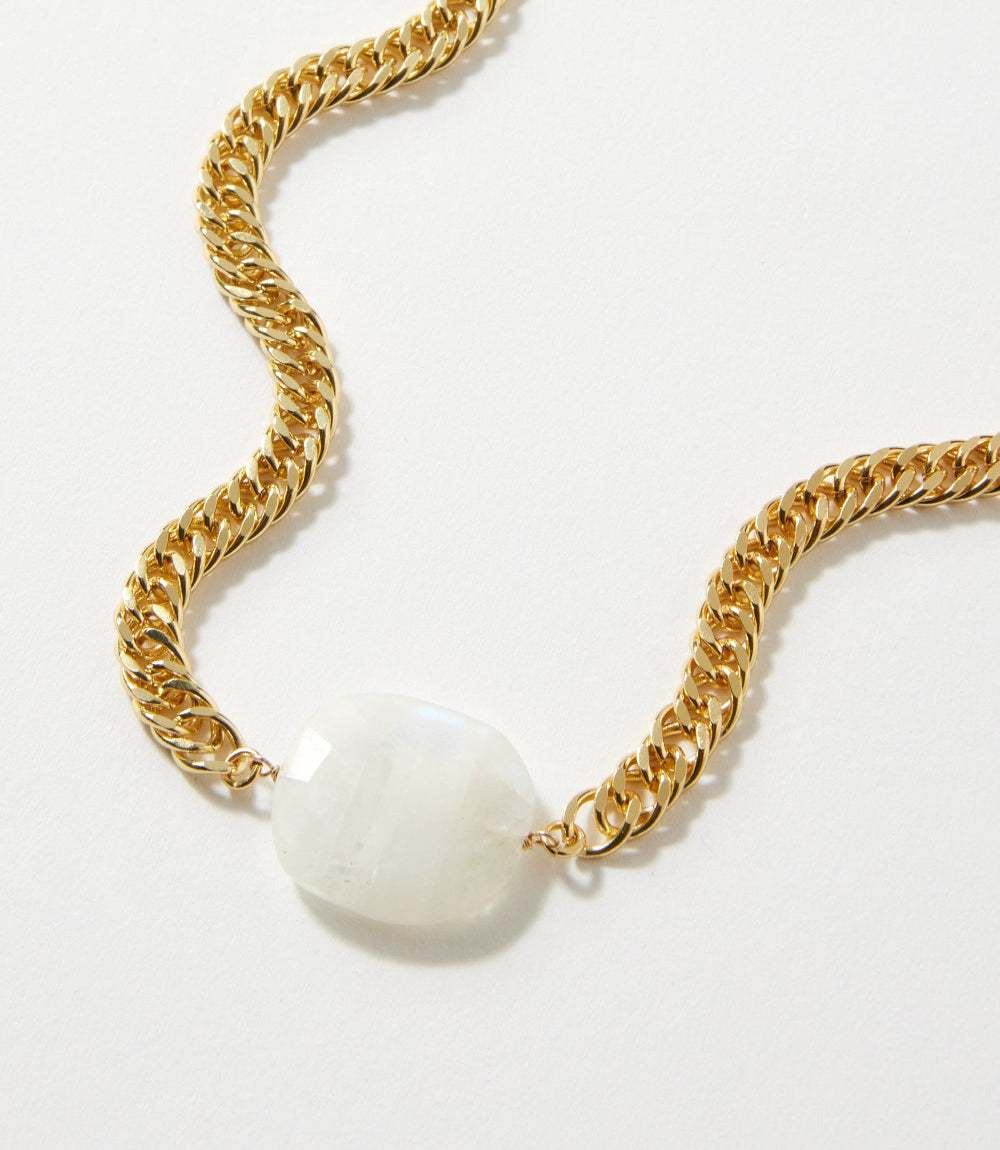 The Moonstone Pendant Necklace features a bold gold-tone chain accented with a luminous white moonstone pendant. The pendant itself is slightly twisted within its setting, enhancing the stone’s natural iridescence and creating a multidimensional shimmer that catches the light beautifully. Finished with a secure lobster clasp and extender, it offers both adjustable length and comfortable wear