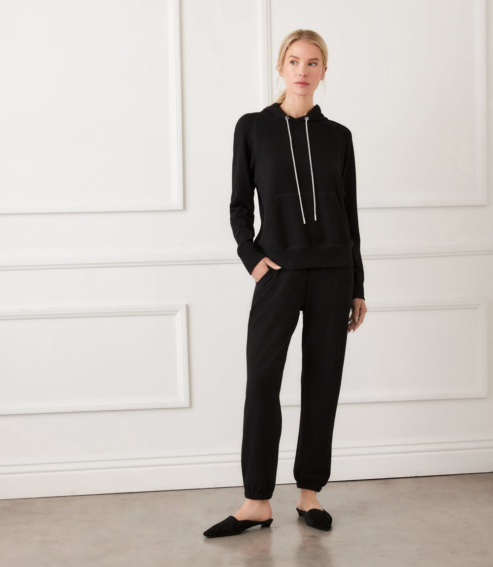 A modern update to the classic hoodie, this sweatshirt is crafted from brushed stretch double knit fabric for a soft and flexible feel. Designed with a pull-on silhouette, it features a hood with rhinestone-embellished drawstrings that add a touch of sparkle. A kangaroo pocket provides laid-back function, while the ribbed hem and cuffs keep the fit polished yet casual.