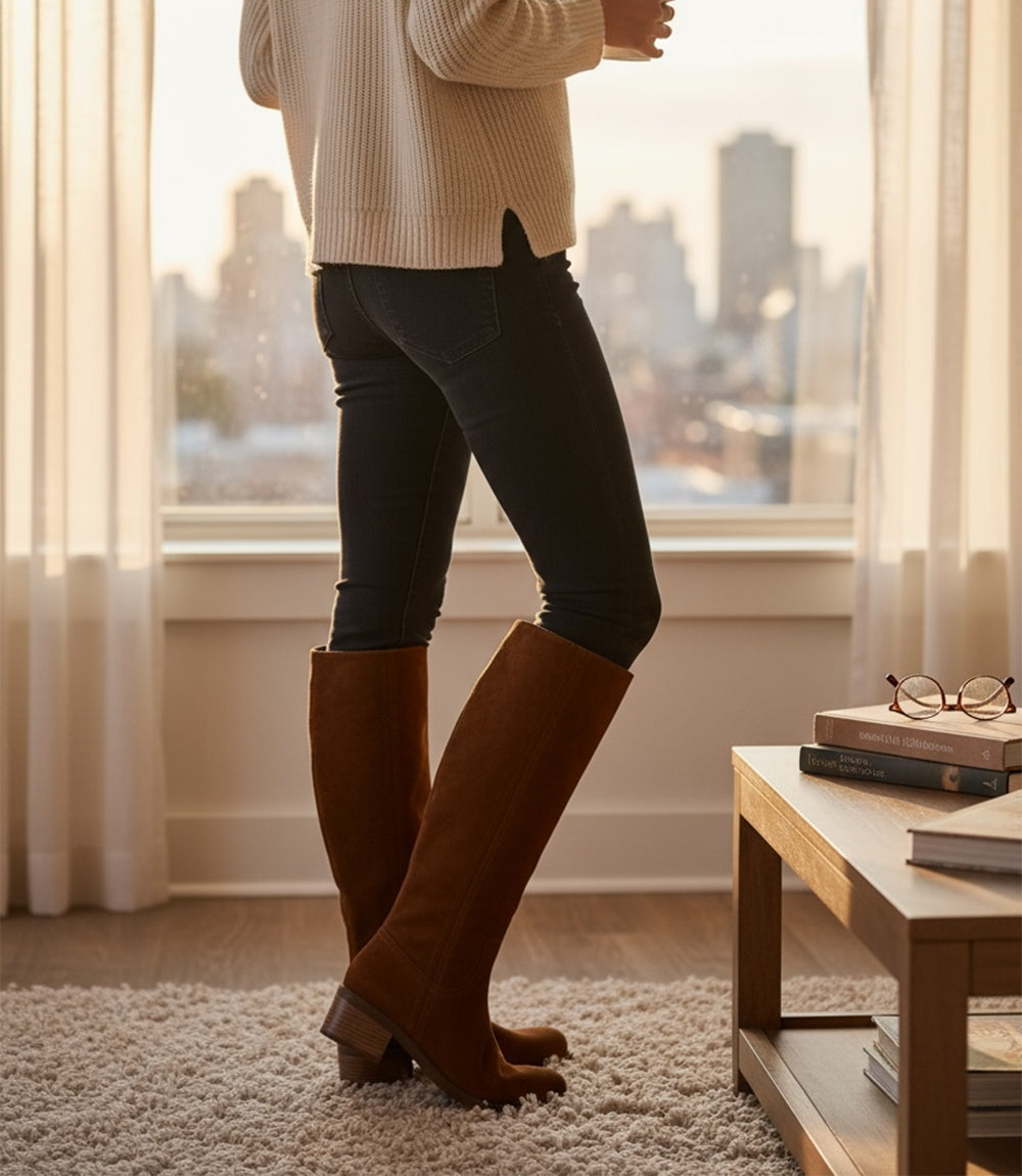 These versatile brown boots feature a round toe and a streamlined silhouette. The comfortable low block heel adds subtle height, while the sleek knee-high shaft offers a chic, elongated look. A side zipper allows for easy on and off, and a hidden elastic inset at the top ensures a flexible fit around the calf.