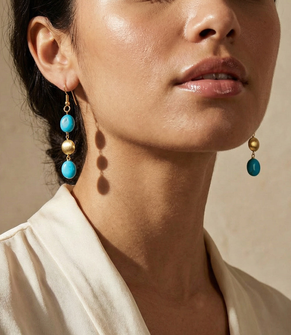 Turquoise and gold triple drop earrings featuring vibrant turquoise beads paired with warm gold accents in a graceful, tiered design. Finished with elegant hooks, these earrings offer beautiful movement and a fresh pop of color, perfect for everyday wear or special occasions.