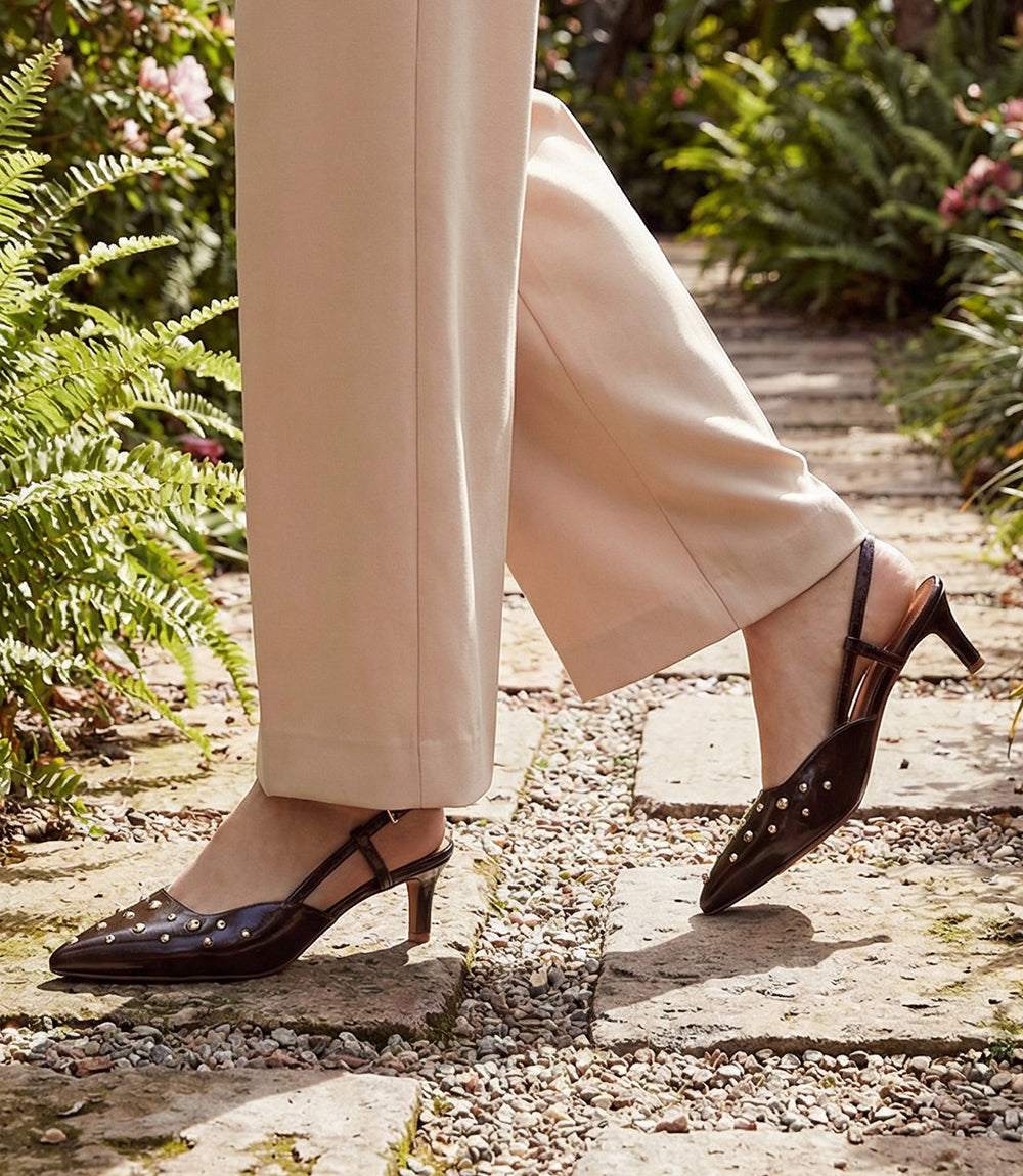 These sleek slingback heels bring a modern edge with polished stud embellishments across the pointed toe. Designed in a rich dark brown hue, they feature a square vamp, adding a structured touch to the silhouette. A low sculpted kitten heel offers effortless sophistication, while the adjustable buckle strap ensures a secure, customizable fit—perfect for seamless day-to-night styling.