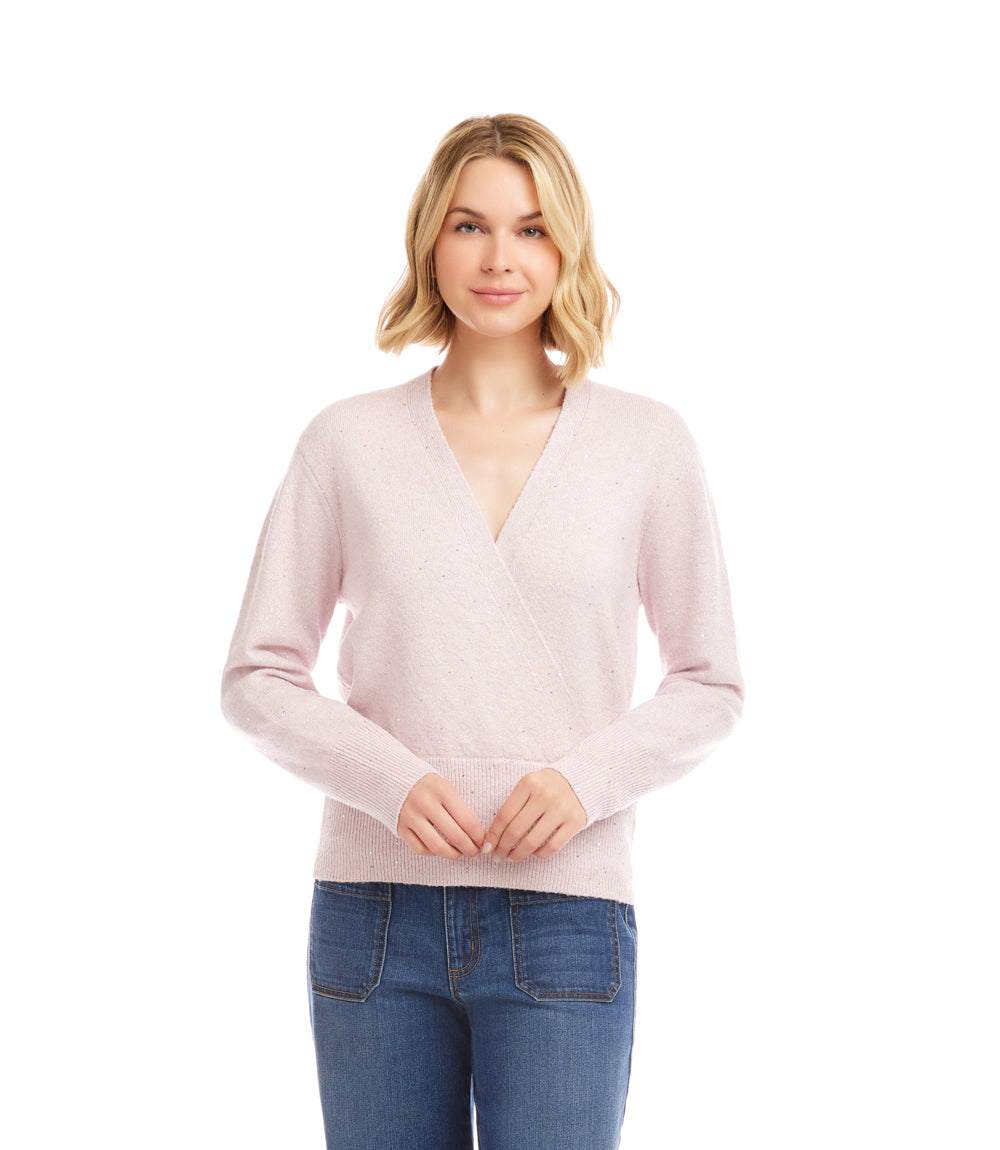 Elevate your knitwear with this effortlessly chic wrap-style sweater. Designed with a crossed V-neckline and slightly dropped shoulders, it creates a flattering silhouette that feels both modern and timeless. The subtle sequin detailing woven into the fabric adds a touch of shimmer, making it perfect for day-to-night wear. Finished with long sleeves and a wide ribbed band at the waist, this pull-on style offers a comfortable yet polished fit.