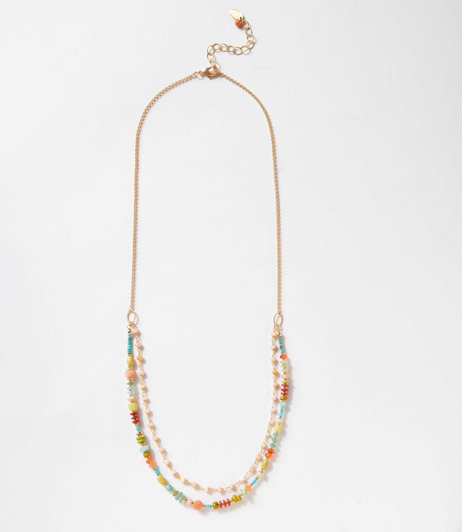 Mixed Gemstone Multistrand Necklace with red jasper, amazonite, turquoise, and matte gold plated brass clasp