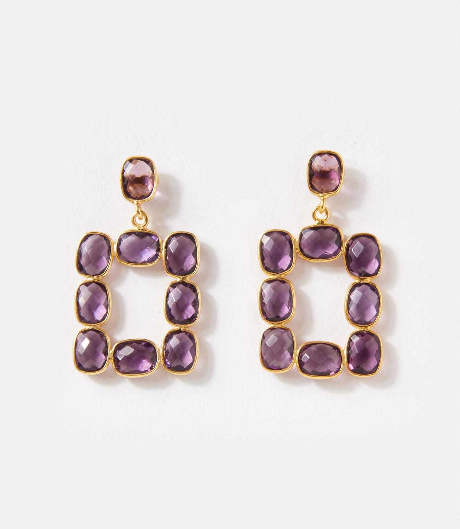 Featuring sleek, rectangular Amethyst gemstones, these earrings capture the subtle elegance of nature’s light. The gemstones iridescent glow creates a captivating effect that shifts with every angle. Set in polished bezel frames, the stones are perfectly showcased, adding a touch of sophistication and timeless charm to any look.